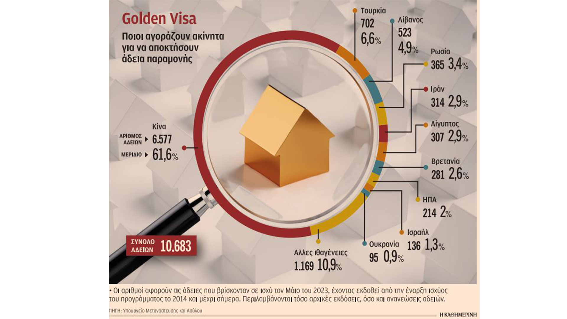 Εν τω μεταξύ, η κορύφωση του επενδυτικού «ρεύματος» προς την ελληνική αγορά έχει αρχίσει να γεννάει καθυστερήσεις στις εγκρίσεις από τις αρμόδιες υπηρεσίες. Σήμερα οι εκκρεμείς άδειες μόνιμου επενδυτή ανέρχονται σε 5.444. Αν προστεθούν οι συγγενείς των επενδυτών αλλά και οι ανανεώσεις προγενέστερων αδειών, ο συνολικός αριθμός των εκκρεμοτήτων ανέρχεται σε 17.742 άδειες. Μόνο κατά τη διάρκεια του τελευταίου 12μήνου (Μάιος 2022 – Μάιος 2023) έχουν υποβληθεί 8.351 αιτήματα χορήγησης αρχικών αδειών και ανανεώσεις, εκ των οποίων έχει εκδοθεί μόλις το 35%.