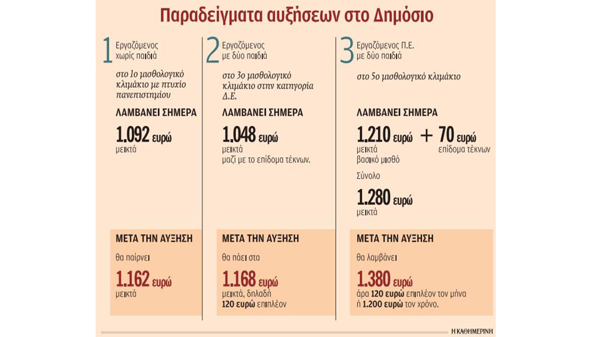 3. Εργαζόμενος Π.Ε. με δύο παιδιά στο 5ο μισθολογικό κλιμάκιο λαμβάνει σήμερα 1.210 ευρώ βασικό μισθό και 70 ευρώ επίδομα τέκνων. Σύνολο 1.280 ευρώ μεικτά. Μετά την αύξηση, θα λαμβάνει 1.380 ευρώ, άρα 120 ευρώ επιπλέον τον μήνα ή 1.200 ευρώ τον χρόνο.
