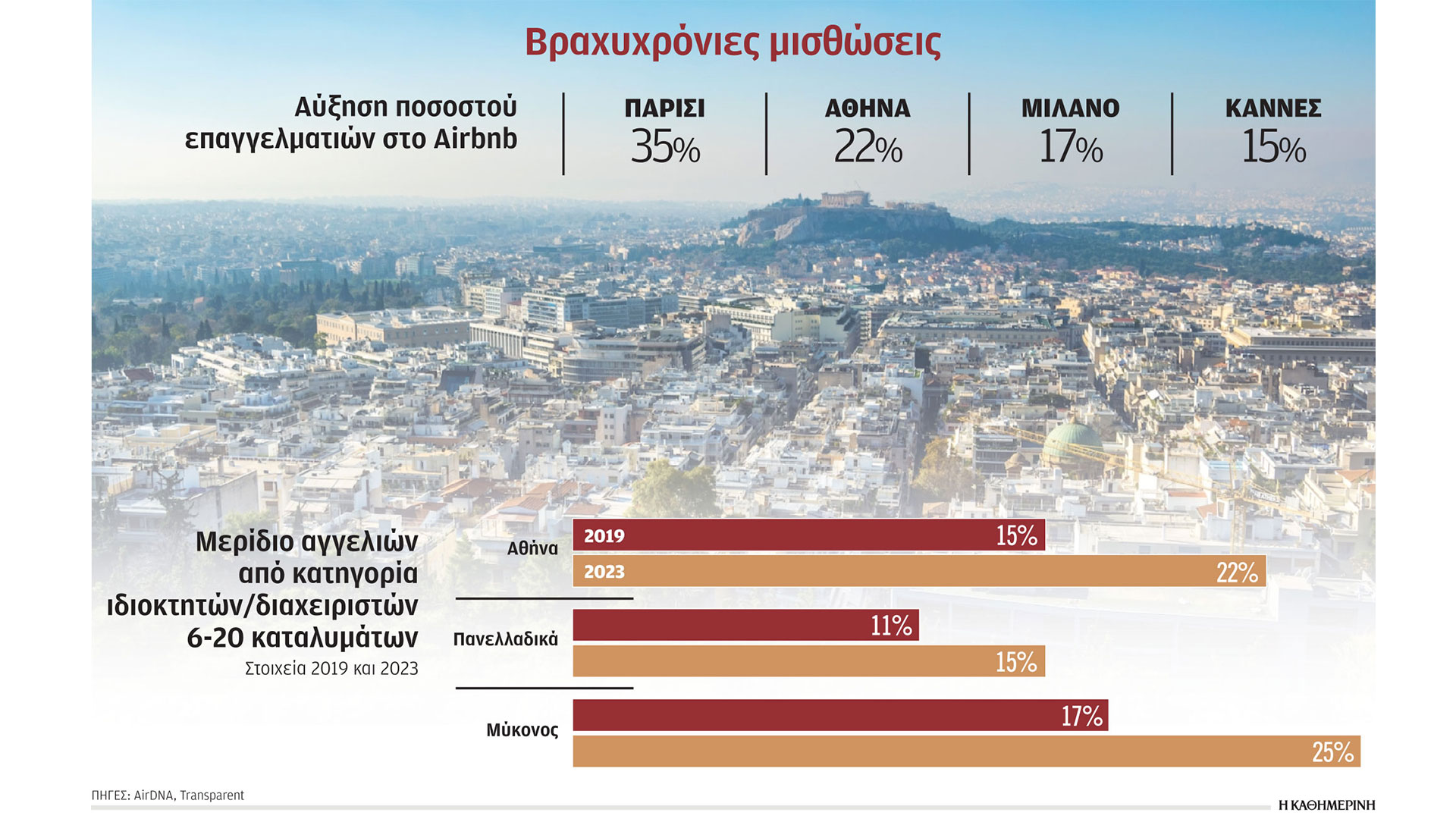 Σύμφωνα με στοιχεία που παρουσίασε η εταιρεία Key Data στο πρόσφατο συνέδριο Short Stay Conference, το 2022 o τζίρος (διαμονής από τα καταλύματα βραχυχρόνιας μίσθωσης) ανήλθε σε 3,46 δισ. ευρώ, με τα έσοδα του Δημοσίου να φθάνουν τα 530 εκατ. ευρώ. Ο αριθμός των καταλυμάτων υπολογίζεται σε 144.000 πανελλαδικά, ενώ οι διανυκτερεύσεις ανήλθαν σε 20,87 εκατ.