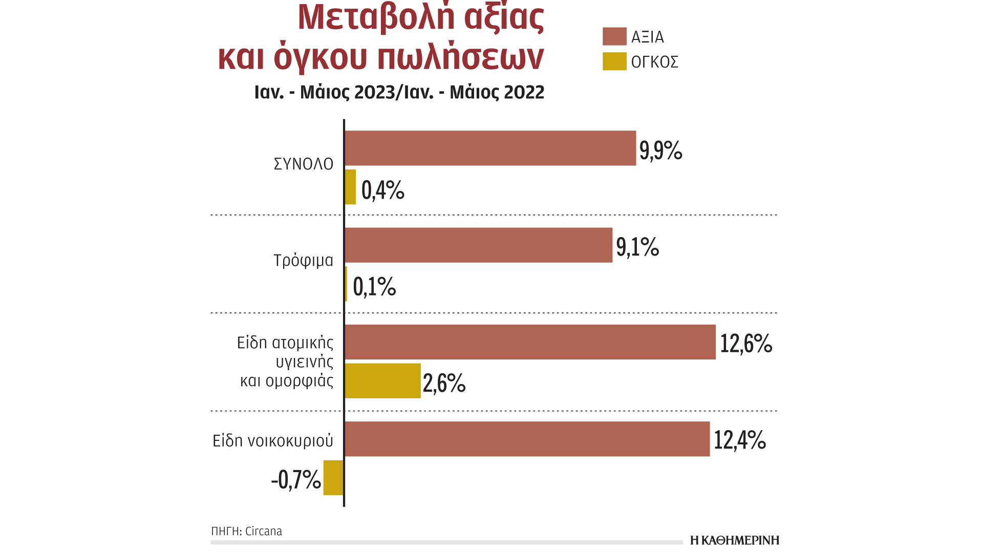 Συνολικά στην κατηγορία των ειδών διατροφής καταγράφηκε οριακή αύξηση του όγκου πωλήσεων κατά 0,1%, ενώ την ίδια ώρα ο τζίρος τους αυξήθηκε κατά 9,1%. Στην κατηγορία των ειδών ατομικής υγιεινής και ομορφιάς καταγράφηκε αύξηση του όγκου πωλήσεων κατά 2,6%, με την αξία πωλήσεων να εκτοξεύεται και να αυξάνεται κατά 12,6%, ενώ μείωση του όγκου πωλήσεων κατά 0,7% καταγράφηκε στα είδη νοικοκυριού, με την αξία πωλήσεων να ενισχύεται στο πεντάμηνο κατά 12,4%.
