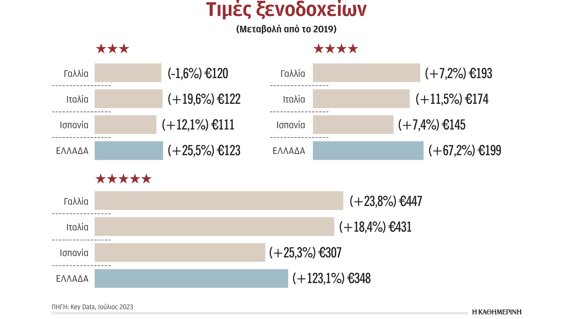 Η Γαλλία και η Ιταλία έχουν τις πιο ακριβές τιμές, ενώ η Ισπανία ξεχωρίζει για τις ανταγωνιστικές τιμές της. Η Ελλάδα έχει την υψηλότερη αύξηση τιμών σε σύγκριση με τις υπόλοιπες χώρες το 2019. Φέτος, οι επισκέπτες των ξενοδοχείων 5 αστέρων θα πρέπει να πληρώσουν 123% περισσότερα από ό,τι το καλοκαίρι του 2019, σύμφωνα με τη Mabrian.