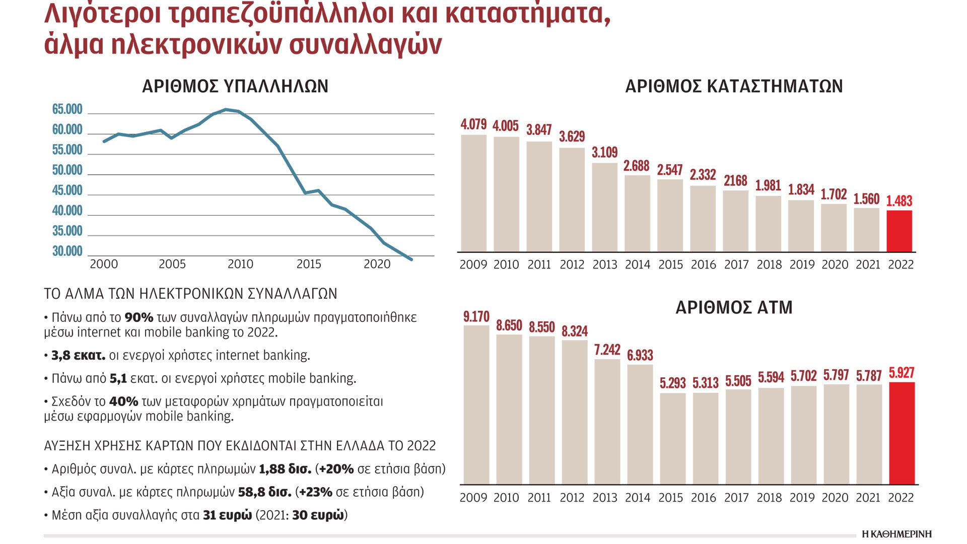 Αντίστοιχη ήταν και η μείωση στην απασχόληση στον τραπεζικό τομέα, με τον αριθμό των τραπεζοϋπαλλήλων την ίδια περίοδο να μειώνεται κατά 55% και συγκεκριμένα από 65.682 σε 29.340, μια τάση που αναμένεται να συνεχιστεί και το 2023, μέσα από νέα προγράμματα εθελουσίας εξόδου για το προσωπικό τους, που υλοποιούν οι τέσσερις συστημικές τράπεζες. Με βάση τα τελευταία διαθέσιμα στοιχεία, η Alpha διαθέτει 280 καταστήματα και 5.958 υπαλλήλους, η Εθνική Τράπεζα 318 καταστήματα και 6.706 υπαλλήλους, η Eurobank 274 καταστήματα και 6.272 υπαλλήλους και η Τράπεζα Πειραιώς 389 καταστήματα και 7.900 υπαλλήλους.