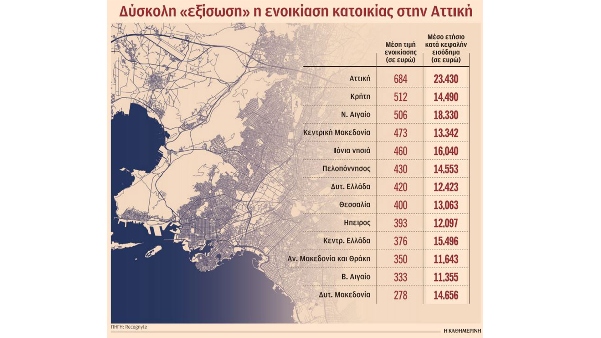 Οπως προκύπτει από σχετική ανάλυση που επιμελήθηκε η εταιρεία Recognyte για λογαριασμό της «Κ», σήμερα, η μέση τιμή ενοικίασης στην Αττική διαμορφώνεται σε 684 ευρώ/μήνα, ποσό που μεταφράζεται σε ετήσια δαπάνη ύψους 8.208 ευρώ. Την ίδια στιγμή, το μέσο κατά κεφαλήν δηλωθέν εισόδημα των φορολογουμένων στην Αττική διαμορφώνεται σε 23.430 ευρώ, κάτι που σημαίνει ότι ένας εργαζόμενος που νοικιάζει ακίνητο, χωρίς να επιμερίζεται το κόστος σε περισσότερα μέλη, θα πρέπει να καταβάλει το 35% των εσόδων του μόνο για να καλύψει το κόστος του ενοικίου. Με βάση την ορθή πρακτική διαχείρισης, το ενοίκιο δεν θα πρέπει να ξεπερνάει το 30% των εσόδων ενός νοικοκυριού.