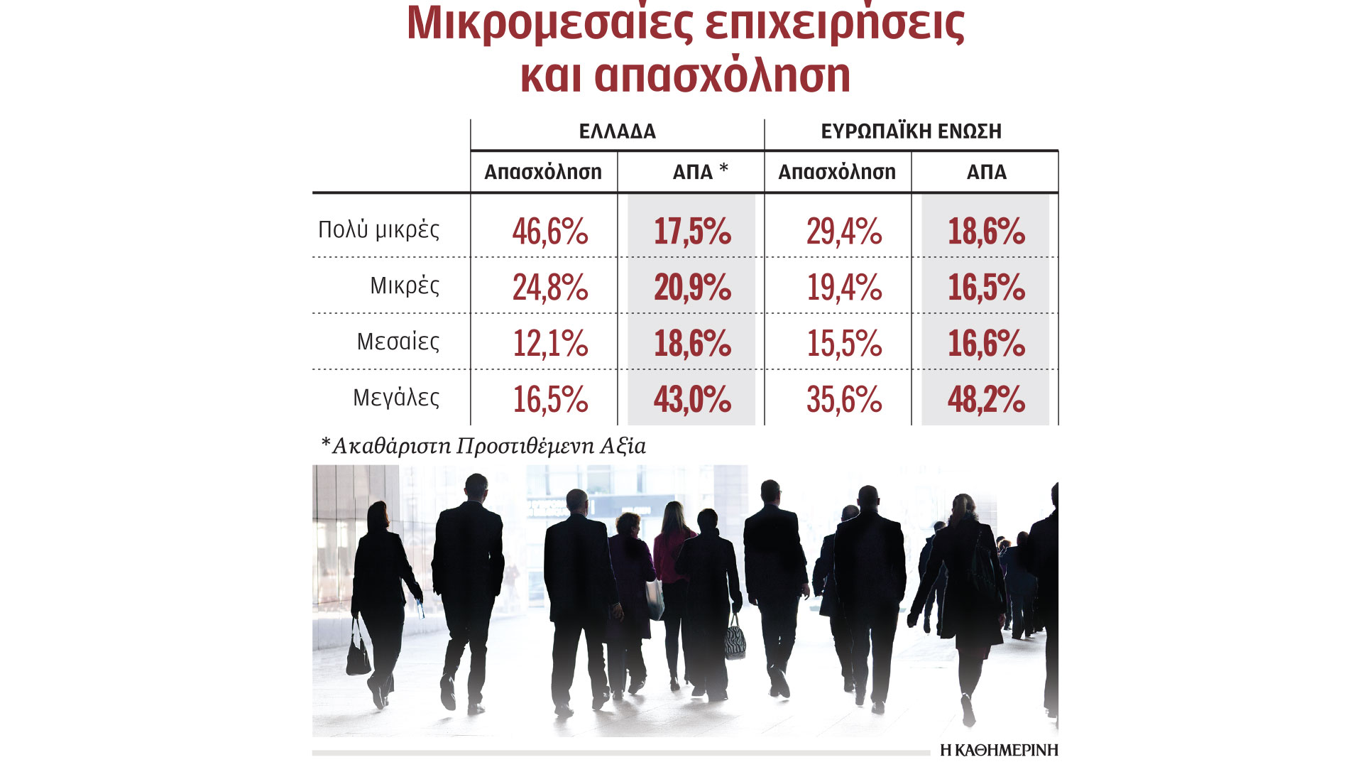 Η ακαθάριστη προστιθέμενη αξία που συνεισφέρουν οι πολύ μικρές επιχειρήσεις στην Ελλάδα είναι 17,5%, όσο περίπου και στην Ε.Ε. (18,6%), ενώ οι μεγάλες επιχειρήσεις συνεισφέρουν το 43% στην Ελλάδα και το 48,2% στην Ε.Ε.