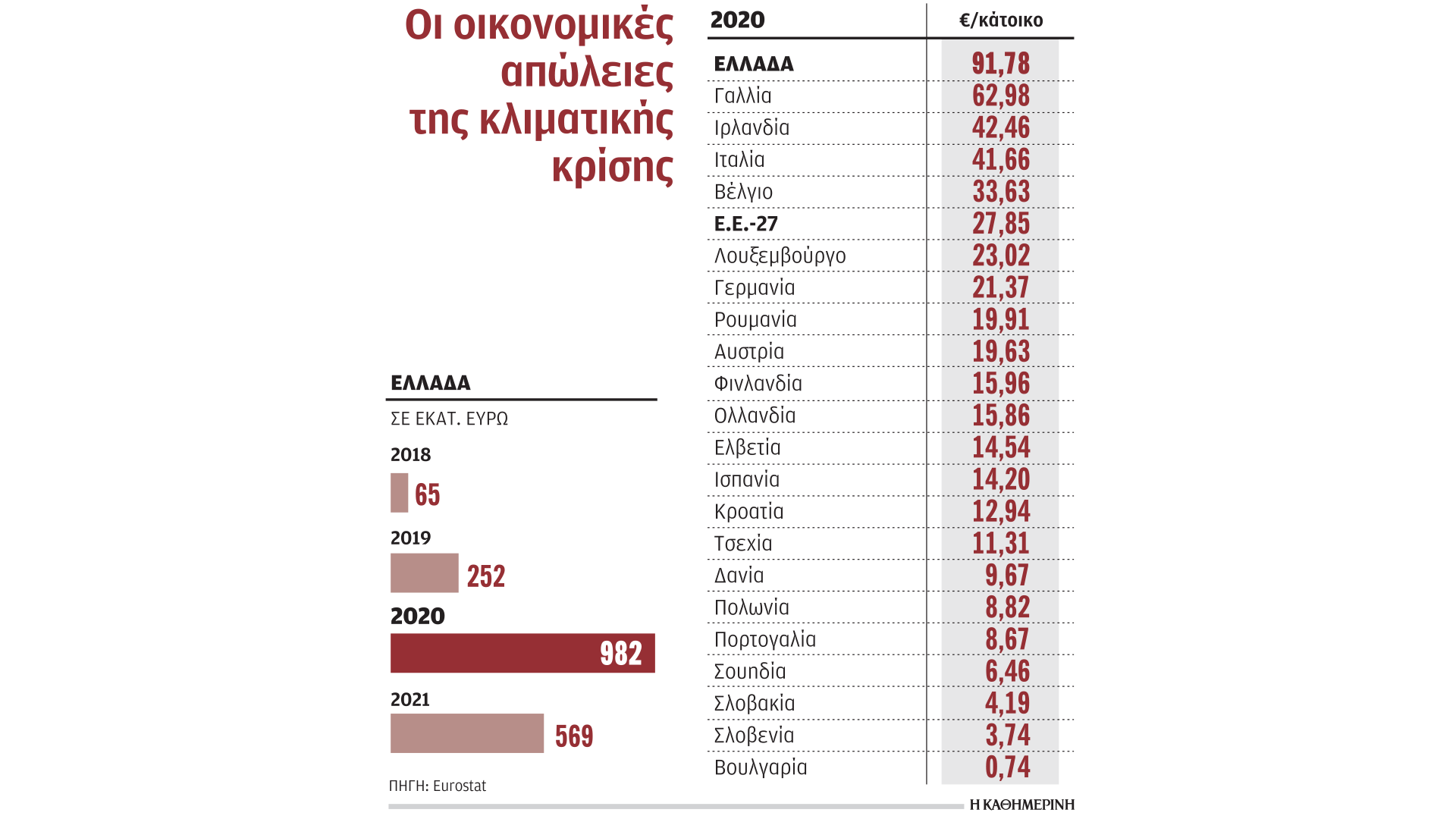 Σύμφωνα με τα στοιχεία της Eurostat και της Ευρωπαϊκής Υπηρεσίας Περιβάλλοντος, οι οικονομικές απώλειες λόγω της κλιματικής αλλαγής κόστισε στις χώρες της Ε.Ε. –ουσιαστικά στους πολίτες της– πάνω από 145 δισ. ευρώ τη δεκαετία 2010-2020, με το κόστος μάλιστα να αυξάνεται κατά 2% κάθε χρόνο. Το 2020 το υψηλότερο κόστος ανά κάτοικο, περίπου 92 ευρώ, καταγράφηκε στην Ελλάδα και ακολούθησε η Γαλλία (62 ευρώ) και η Ιρλανδία (42 ευρώ), με το μέσο κόστος ανά κάτοικο στην Ε.Ε. να διαμορφώνεται το 2020 σε 27 ευρώ.