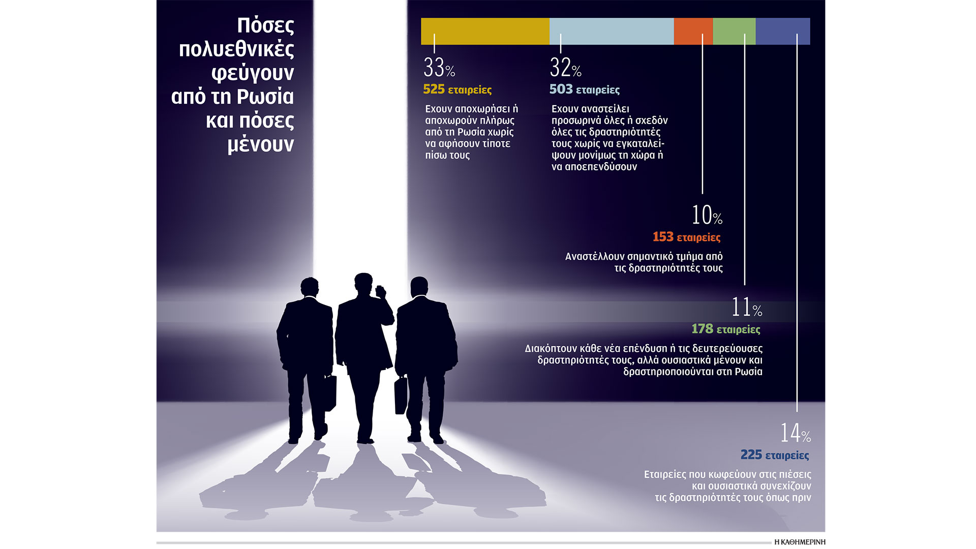 Οπως προκύπτει από σχετική διεξοδική έρευνα του Πανεπιστημίου Yale, περισσότερες από 1.000 πολυεθνικές έχουν πλήρως εγκαταλείψει τη Ρωσία μετά την εισβολή της στην Ουκρανία. Ανάμεσα στα πλέον ηχηρά ονόματα της παγκόσμιας βιομηχανίας που έφυγαν με το πρώτο κύμα ηρωικής εξόδου, συχνά με σημαντικό οικονομικό κόστος, συγκαταλέγονται οι πετρελαϊκοί κολοσσοί BP, Shell και ExxonMobil, η McDonald που πούλησε με συνοπτικές διαδικασίες τα 850 εστιατόριά της σε τοπική αλυσίδα και η γαλλική αυτοκινητοβιομηχανία Renault που δέχθηκε να εκχωρήσει το πλειοψηφικό της πακέτο στην τοπική Avtovaz έναντι συμβολικού τιμήματος ύψους ενός ευρώ. Παράλληλα, όμως, περίπου ενάμισι έτος μετά τη ρωσική εισβολή στην Ουκρανία και παρά τις εντεινόμενες πιέσεις από τη Δύση, τουλάχιστον 400 μεγάλες πολυεθνικές εξακολουθούν να δραστηριοποιούνται στη Ρωσία παράγοντας βέβαια εκατοντάδες δισ. δολάρια στη χώρα.