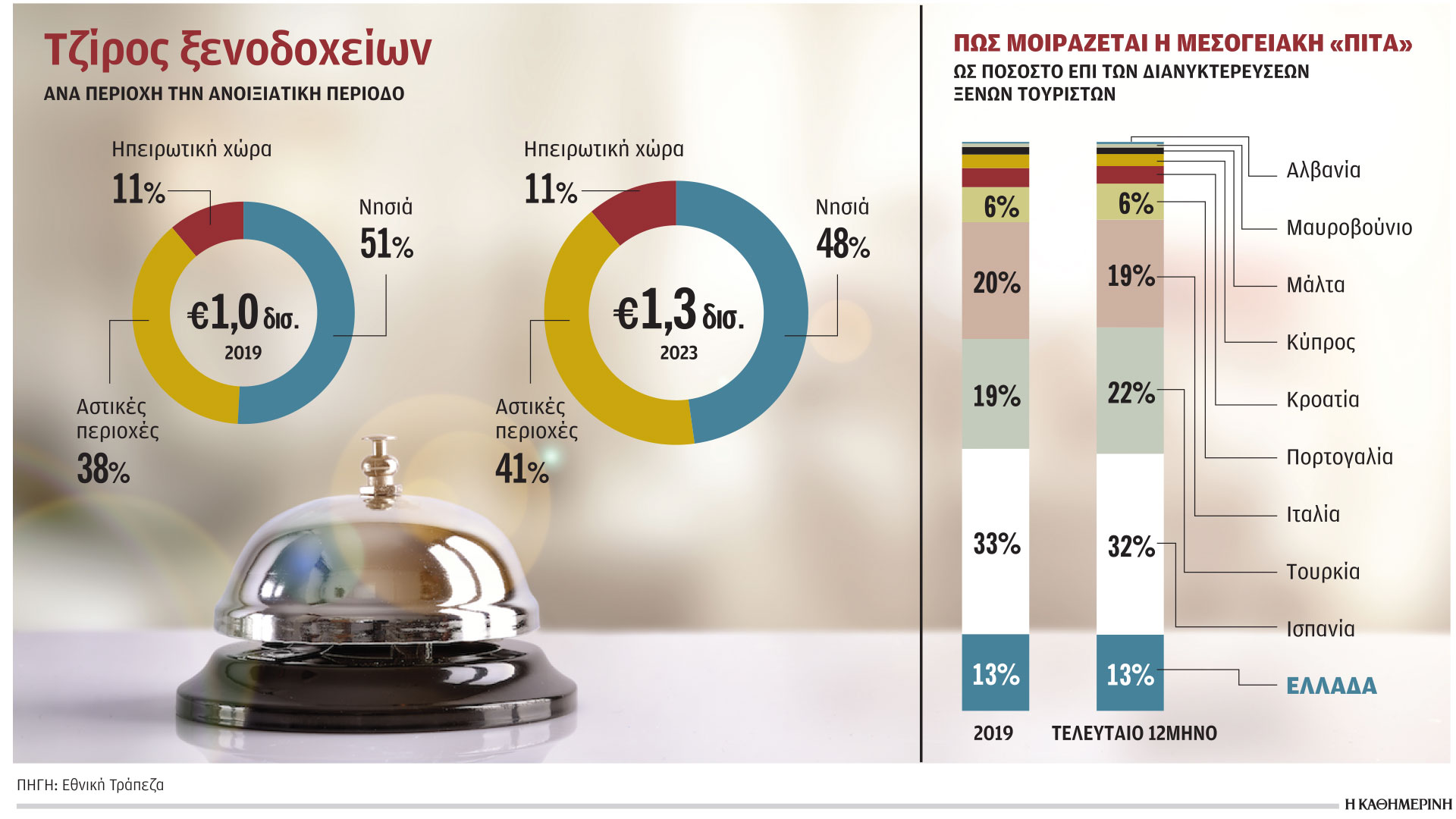 Αλλο βασικό χαρακτηριστικό της φετινής τουριστικής περιόδου είναι η ταχύτερη έναρξή της, γεγονός που αποτυπώθηκε στις πολύ καλές επιδόσεις των αστικών προορισμών. Μια βόλτα άλλωστε στο κέντρο της Αθήνας αρκεί για να πείσει και τους πιο επιφυλακτικούς, με την πρωτεύουσα πλέον να αποτελεί προορισμό και όχι απλώς «πέρασμα» για τους τουρίστες πριν καταλήξουν σε κάποιο νησί. Κατά την εαρινή περίοδο οι πωλήσεις των ξενοδοχείων των αστικών περιοχών αύξησαν το μερίδιό τους σε 41% από 38% το 2019, ενώ αντιθέτως υποχώρησε το μερίδιο των νησιών σε 48% από 51% και παρέμεινε ίδιο το μερίδιο των ηπειρωτικών περιοχών (11%).