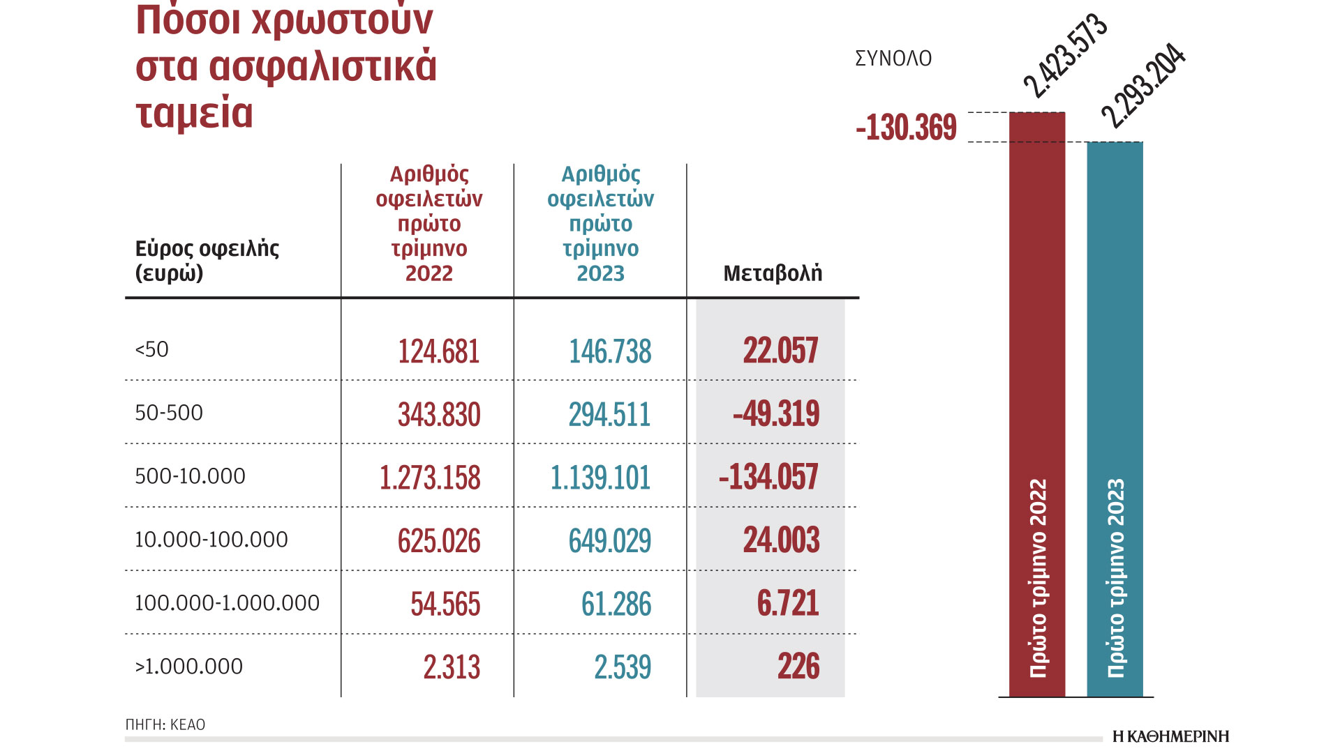 Παράλληλα, συνεχίζουν τις διαδικασίες λήψης στοχευμένων αναγκαστικών μέτρων για την ενίσχυση της εισπραξιμότητας του Κέντρου αλλά και τη συμμόρφωση των οφειλετών. Μάλιστα, βάσει του επιχειρησιακού σχεδίου του ΚΕΑΟ για το 2023, ο στόχος για έγκαιρη και συγκεκριμένα εντός τριμήνου από την ένταξη των οφειλετών στο Κέντρο λήψη αναγκαστικών μέτρων παραμένει σταθερός, με τη διοίκηση να εκτιμά ότι μπορεί να εισπραχθούν συνολικά περίπου 1,6 δισ. ευρώ έως το τέλος του έτους. Ηδη, σύμφωνα με τα τελευταία στοιχεία, για το πρώτο τρίμηνο του 2023 έχουν εισπραχθεί 418,5 εκατ. ευρώ, εκ των οποίων τα 170 εκατ. ευρώ αφορούν εισπράξεις εκτός ρυθμίσεων. Η τελευταία προσπάθεια για αναβίωση των παλαιών ρυθμίσεων δεν επέφερε τα αναμενόμενα αποτελέσματα. Είναι χαρακτηριστικό ότι, ενώ οι δυνητικοί δικαιούχοι ήταν 260.000, εντάχθηκαν μόλις 52.000 για χρέη 700 εκατ. ευρώ και ήδη από αυτούς απώλεσαν και τη νέα ρύθμιση γύρω στους 10.500.