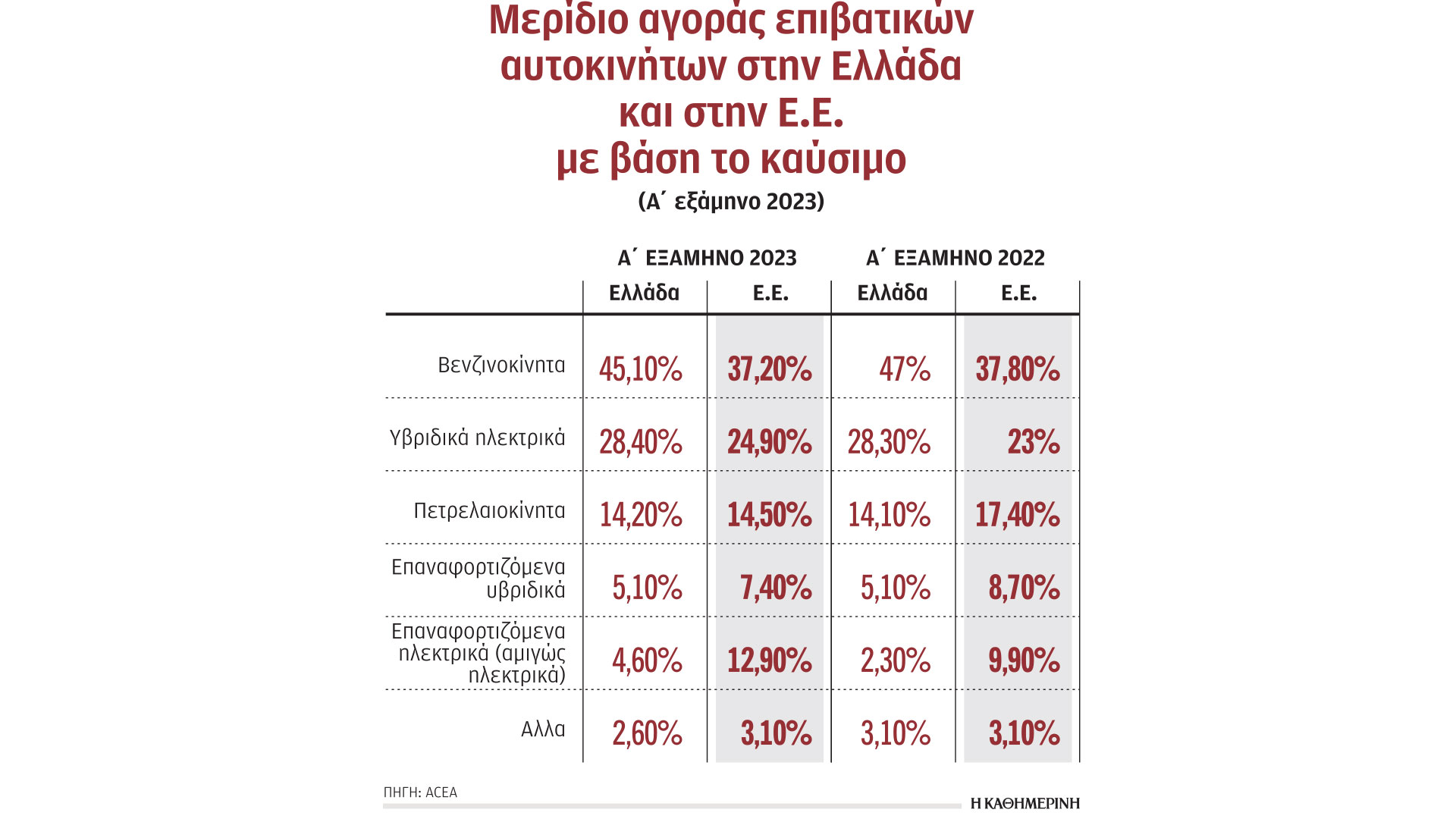 Σύμφωνα με τα τελευταία στοιχεία του Ευρωπαϊκού Συνδέσμου Κατασκευαστών Αυτοκινήτου (ACEA), κατά το α΄ εξάμηνο του 2023 το μερίδιο αγοράς των αμιγώς ηλεκτρικών αυτοκινήτων (επαναφορτιζόμενα ηλεκτρικά με μπαταρία χωρίς κινητήρα εσωτερικής καύσης) ήταν στην Ελλάδα 4,60%, ενώ στην Ευρωπαϊκή Ενωση το ποσοστό ήταν σχεδόν τριπλάσιο, της τάξεως του 12,90%. Αξίζει πάντως να σημειωθεί ότι το μερίδιο αγοράς στην Ελλάδα διπλασιάστηκε σε σύγκριση με το α΄ εξάμηνο του 2022, καθώς πέρυσι ήταν 2,30%, ενώ στην Ε.Ε. κάτω από 10% και συγκεκριμένα 9,90%.