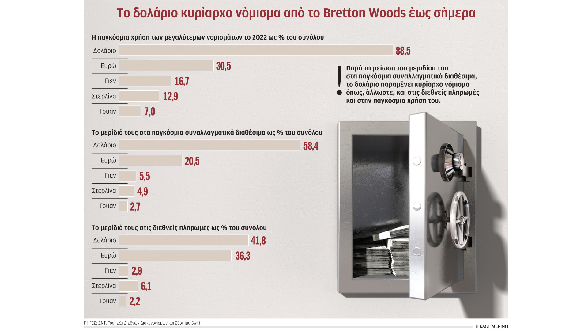 Οι εκ πρώτης όψεως επενδυτικής φύσεως αυτές επιλογές έπονται σειράς αντίστοιχων κινήσεων από πλευράς των χωρών του λεγόμενου «παγκόσμιου Νότου», χωρών που είτε δεν πρόσκεινται στην Ουάσιγκτον είτε βλέπουν τα συμφέροντά τους να αποκλίνουν από εκείνα του δυτικού στρατοπέδου και ανησυχούν για ενδεχόμενες οικονομικές επιπτώσεις επιλογών τους μη αρεστών στην υπερδύναμη. Ειδικότερα, μετά τις σαρωτικές κυρώσεις που επέβαλαν η Ουάσιγκτον και η Ε.Ε. στη Ρωσία «παγώνοντας» συναλλαγματικά της διαθέσιμα ύψους άνω των 300 δισ. δολ. Εχουν, έτσι, μειώσει την έκθεσή τους στους αμερικανικούς τίτλους, ενώ παράλληλα περιορίζουν το μερίδιο του δολαρίου στα συναλλαγματικά τους διαθέσιμα. Συνεπώς, στα τέλη του 2022 το δολάριο αντιπροσώπευε μόλις το 58% των παγκόσμιων συναλλαγματικών διαθεσίμων, καταγράφοντας σημαντική μείωση από το άνω του 70% που ήταν το μερίδιό του το 1999.