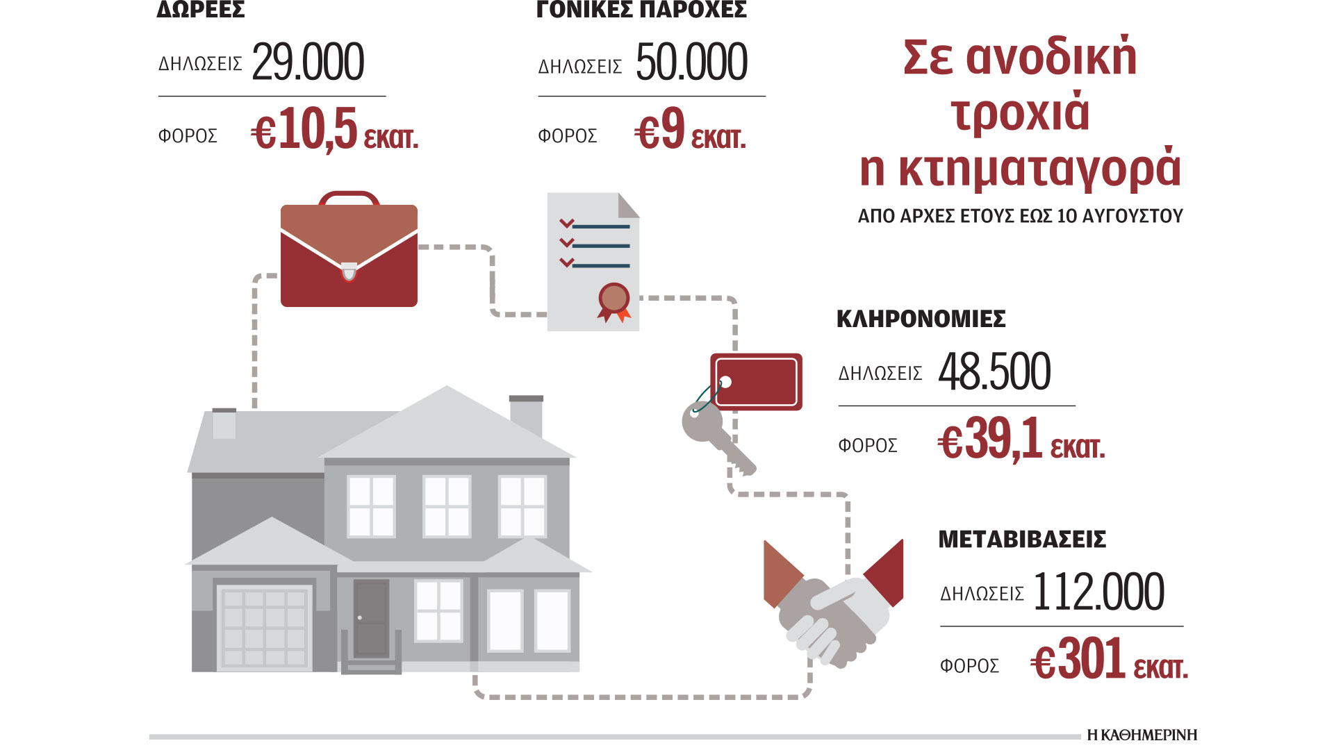 Με βάση τα στοιχεία της ΑΑΔΕ στην πρώτη γραμμή βρίσκονται οι αγοραπωλησίες ακινήτων, ενώ σε ανοδική τροχιά κινούνται οι γονικές παροχές και δωρεές λόγω του υψηλού αφορολόγητου ορίου των 800.000 ευρώ.