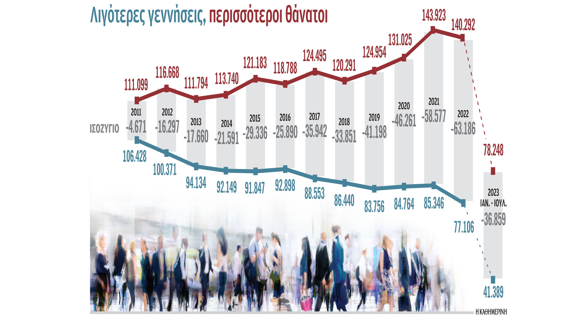 To 2023 θα είναι η 12η διαδοχική χρονιά μείωσης του πληθυσμού της χώρας λόγω αρνητικού ισοζυγίου γεννήσεων – θανάτων. Το πρόβλημα επιδεινώνεται τα τελευταία χρόνια, με τις «σύγχρονες κρίσεις» (πανδημία, πληθωριστική και περιβαλλοντική κρίση) να παίζουν καθοριστικό ρόλο.