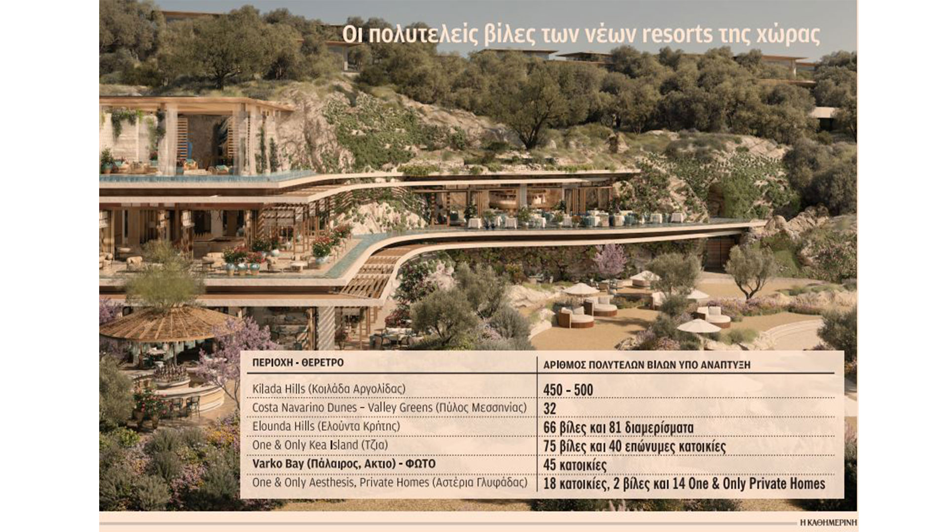 Περί τις 900 πολυτελείς κατοικίες, με συνολική εκτιμώμενη αξία πώλησης άνω του 1 δισ. ευρώ, αναπτύσσονται αυτή την περίοδο σε διάφορες περιοχές της χώρας, εντός των ορίων οργανωμένων τουριστικών καταλυμάτων (resorts). Πρόκειται για μια δεδομένη επιλογή των επενδυτών, προκειμένου να αξιοποιήσουν τη μεγάλη ζήτηση για εξοχικές κατοικίες από ξένους αγοραστές, ιδίως σε περιοχές ήπιας ανοικοδόμησης και παρθένου τοπίου, που η Ελλάδα προσφέρει σε αφθονία, κάτι που δεν ισχύει σε άλλες ανεπτυγμένες αγορές της Νότιας Ευρώπης.