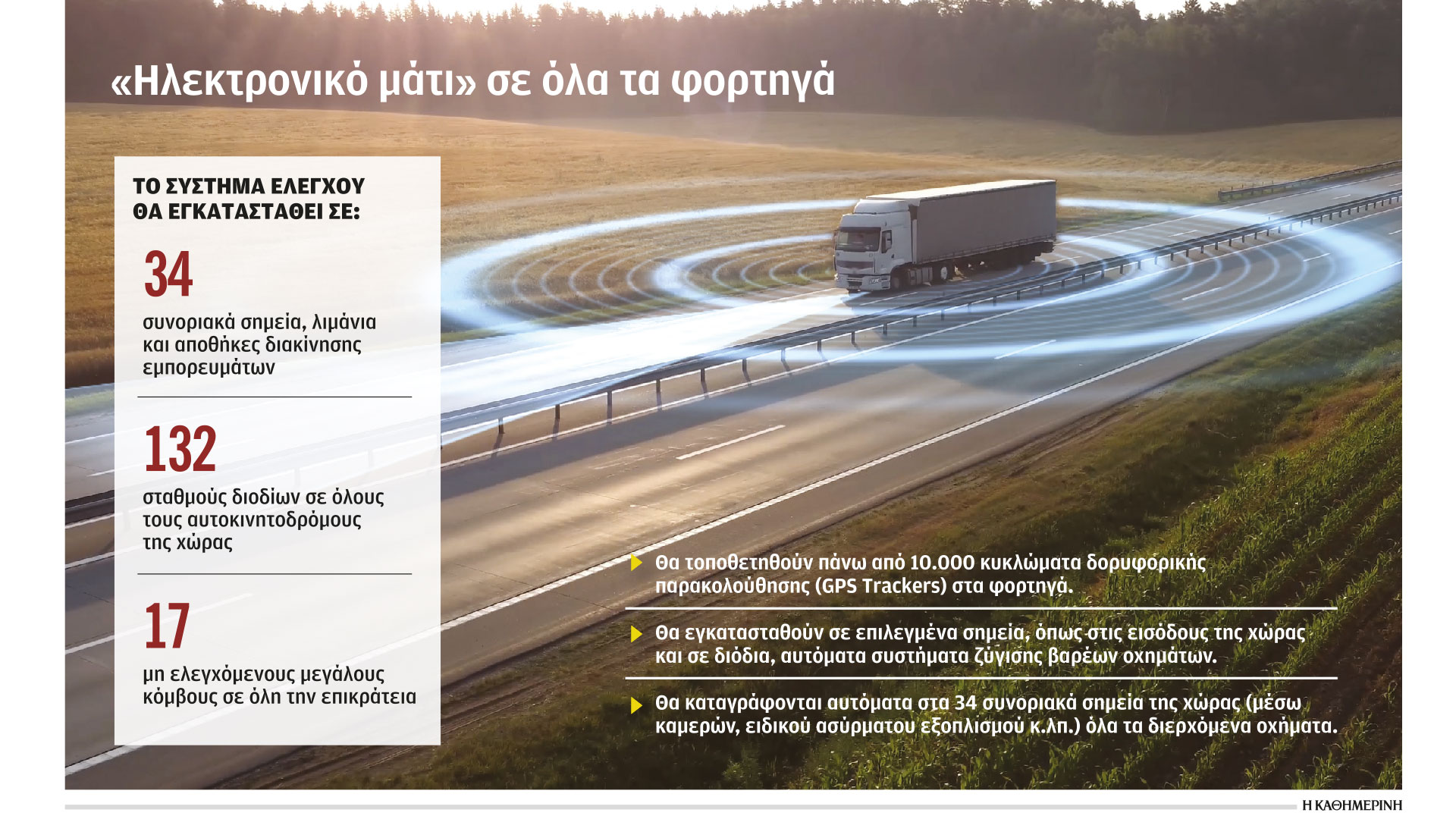 Παράλληλα, θα τοποθετηθούν πάνω από 10.000 κυκλώματα δορυφορικής παρακολούθησης (GPS Trackers) στα φορτηγά και κοντέινερ που κινούνται επί ελληνικού εδάφους. Επίσης, θα εγκατασταθούν σε επιλεγμένα σημεία, όπως στις εισόδους της χώρας και στους σταθμούς διοδίων, συστήματα ζύγισης βαρέων οχημάτων, όπου θα μπορεί να ζυγίζεται αυτόματα το όχημα στη δεξιά λωρίδα των διοδίων με τέτοιον τρόπο ώστε να διευκολύνεται ο έλεγχος.