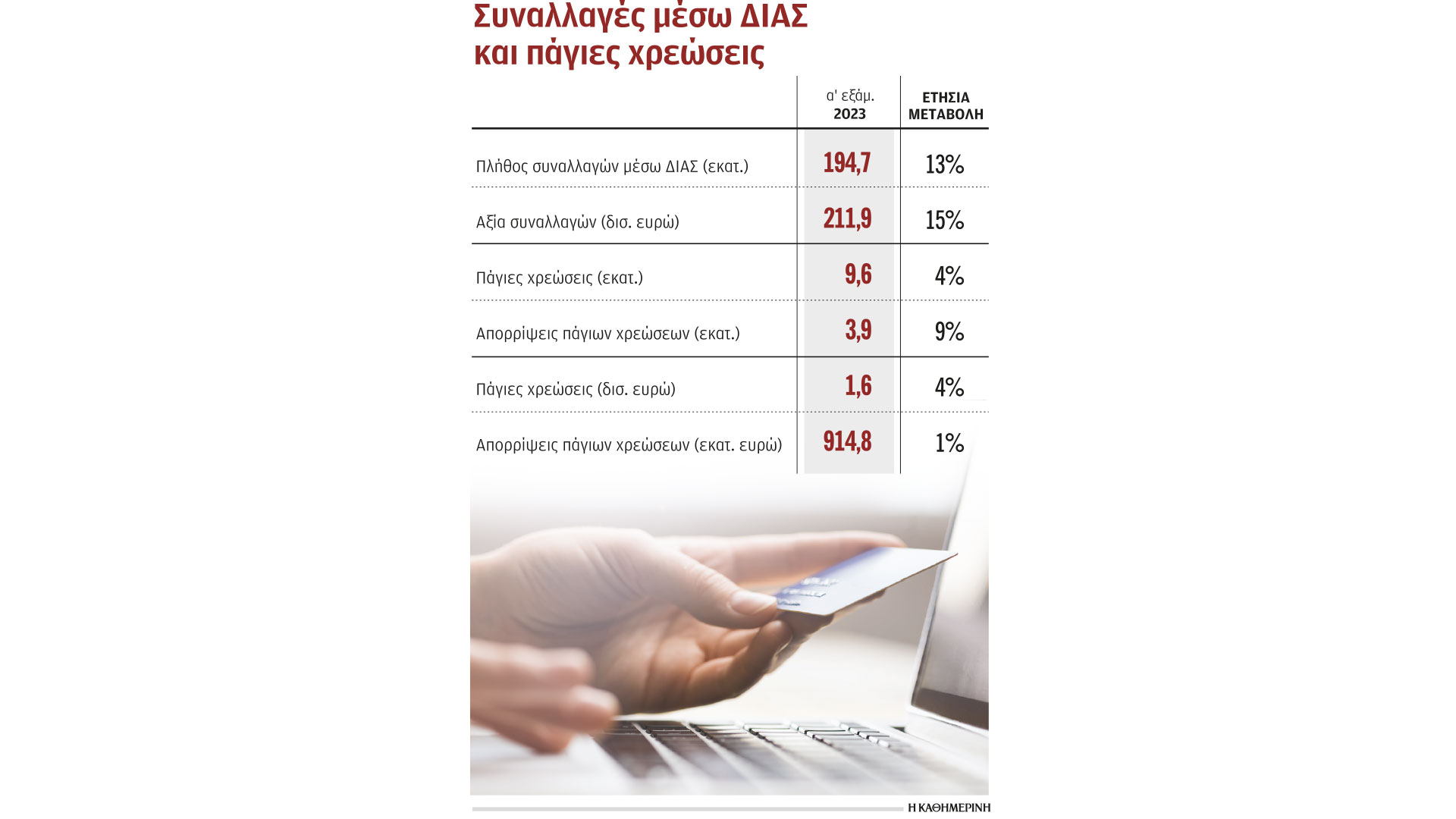 Τα στοιχεία του συστήματος ΔΙΑΣ επιβεβαιώνουν τη συνεχιζόμενη αύξηση των ηλεκτρονικών συναλλαγών, καθώς το α΄ εξάμηνο του 2023 πραγματοποιήθηκαν 194,7 εκατ. συναλλαγές αξίας 211,9 δισ. ευρώ, καταγράφοντας αύξηση κατά 13% και 15% αντίστοιχα σε σχέση με το α΄ εξάμηνο του 2022. Ολοένα και μεγαλύτερο έδαφος κερδίζουν οι διατραπεζικές συναλλαγές, τα γνωστά διατραπεζικά εμβάσματα, που αυξήθηκαν κατά 37% στα 38,3 εκατ., ενώ σε όρους αξίας αυξήθηκαν κατά 20% και ανήλθαν σε 109,5 δισ. ευρώ.