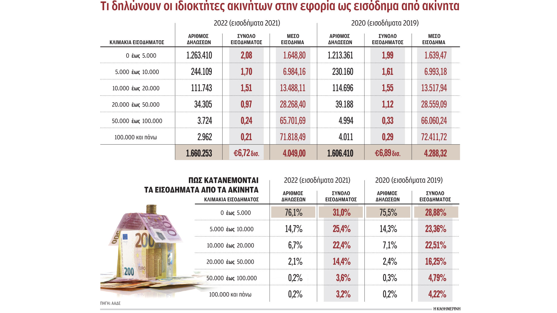 Φαινόμενο «αυτοαπασχολούμενου» και στα εισοδήματα από ενοίκια αποτυπώνουν τα στοιχεία των φορολογικών δηλώσεων. Οπως οι ελεύθεροι επαγγελματίες φροντίζουν επιμελώς το καθαρό τους εισόδημα να μην ξεπερνά τις 10.000 ευρώ ώστε να μην ξεφεύγουν από τον χαμηλό συντελεστή του 9%, έτσι και η πλειονότητα των ιδιοκτητών δηλώνει ετήσια εισοδήματα από ενοίκια κάτω από 12.000 ευρώ, ώστε να μην ξεφεύγει ο συντελεστής από το 15%. Τόσο στις δηλώσεις του 2020 (σ.σ. οι οποίες δεν είχαν επηρεαστεί από την πανδημία καθώς αποτύπωσαν τα εισοδήματα από ενοίκια) όσο και στις περυσινές φορολογικές δηλώσεις, η εικόνα ήταν αντίστοιχη: το 76% των ιδιοκτητών δηλώνει εισοδήματα έως 5.000 ευρώ και το 14%-15% εισοδήματα από 5.000 έως 10.000 ευρώ. Το όριο των 10.000 ευρώ (και μέχρι του ποσού των 20.000 ευρώ σε ετήσια βάση) ξεπερνούν μόλις οι 7 στους 100). Αρα, πάνω από το 90% των ιδιοκτητών ακινήτων φορολογούνται στην Ελλάδα με τον συντελεστή του 15% για το εισόδημα που αποκτούν από ενοίκια. Αυτό επιτυγχάνεται και λόγω των πραγματικών συνθηκών (σ.σ. η μεγάλη πλειονότητα των ιδιοκτητών στην Ελλάδα έχει μικρής αξίας ακίνητα στην κατοχή της, άρα ανάλογα είναι χαμηλό και το εισόδημα) αλλά και με τεχνικούς τρόπους. Ο ένας τρόπος είναι η καθαρή φοροδιαφυγή και ο δεύτερος ο κατακερματισμός της περιουσίας μεταξύ συγγενικών προσώπων, ώστε αναλόγως διασφαλίζεται σε περισσότερα πρόσωπα και το δικαίωμα φορολόγησης με τον χαμηλό συντελεστή του 15%.