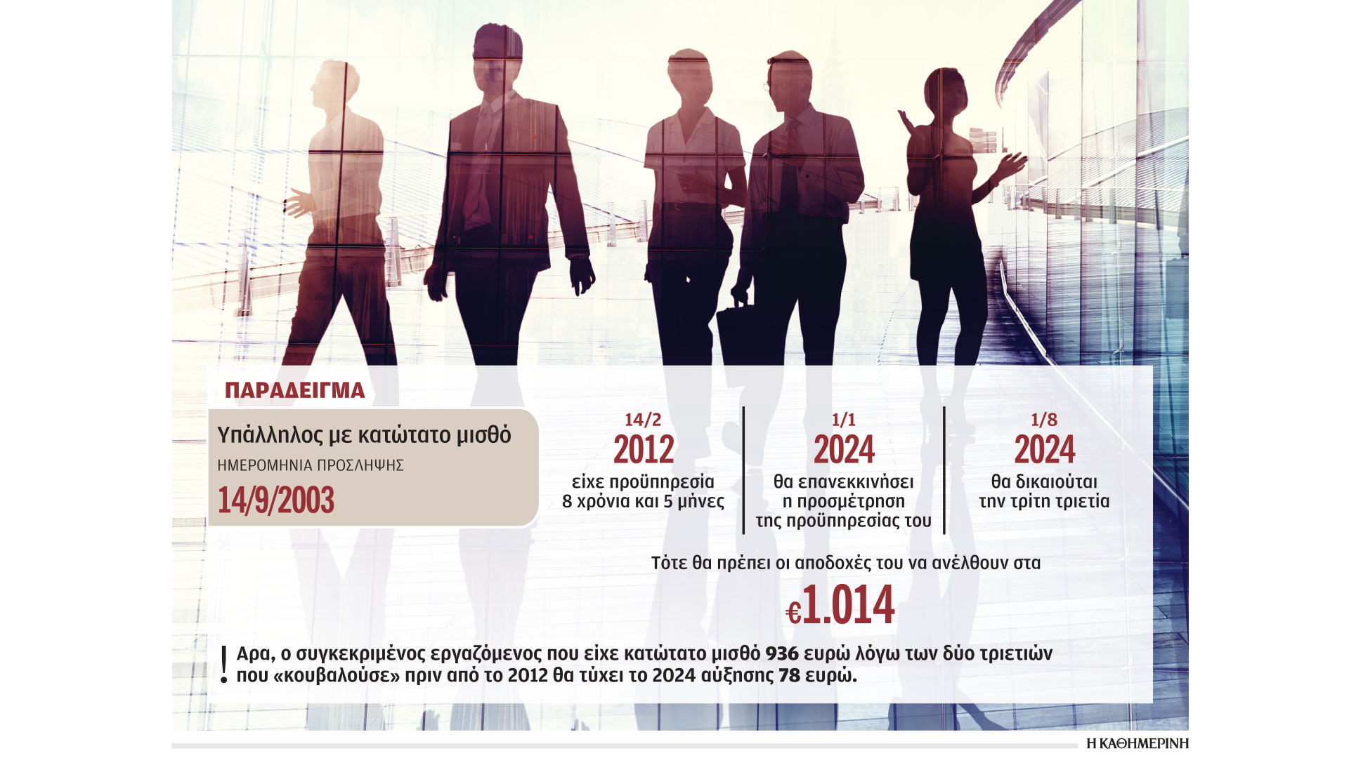 • Για όσους προσλήφθηκαν μετά το 2012, το «χτίσιμο» της προϋπηρεσίας θα γίνει από 1/1/2024. Αυτό σημαίνει πως η υποχρέωση για τους νέους εργαζομένους έρχεται εμπροσθοβαρώς.