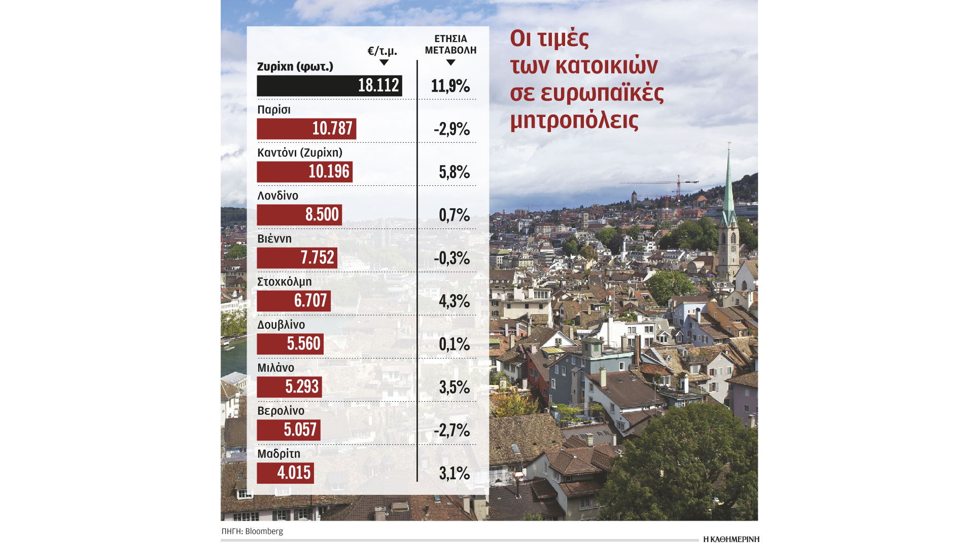 Σε μία από τις ακριβότερες αγορές στέγης της Ευρώπης έχει εξελιχθεί η Ζυρίχη, με τις τιμές των κατοικιών να βρίσκονται σε επίπεδα πολύ υψηλότερα από εκείνα του Λονδίνου και του Παρισιού, δύο ευρωπαϊκών πρωτευουσών φημισμένων για την ακρίβειά τους. Αιτία είναι η ανεπάρκεια στέγης, συνεπακόλουθο και αυτή του μεγάλου αριθμού υπαλλήλων μεγάλων επιχειρήσεων που εγκαθίσταται στην ελβετική πόλη. Με επιχειρηματικούς κολοσσούς όπως η Google να αυξάνουν το προσωπικό τους στη Ζυρίχη, οι ενδιαφερόμενοι αναγκάζονται να συμβιβαστούν με το δυσθεώρητο κόστος της στέγης και να αγνοήσουν τα υψηλά επιτόκια που οδηγούν στα ύψη τις δόσεις των στεγαστικών δανείων.