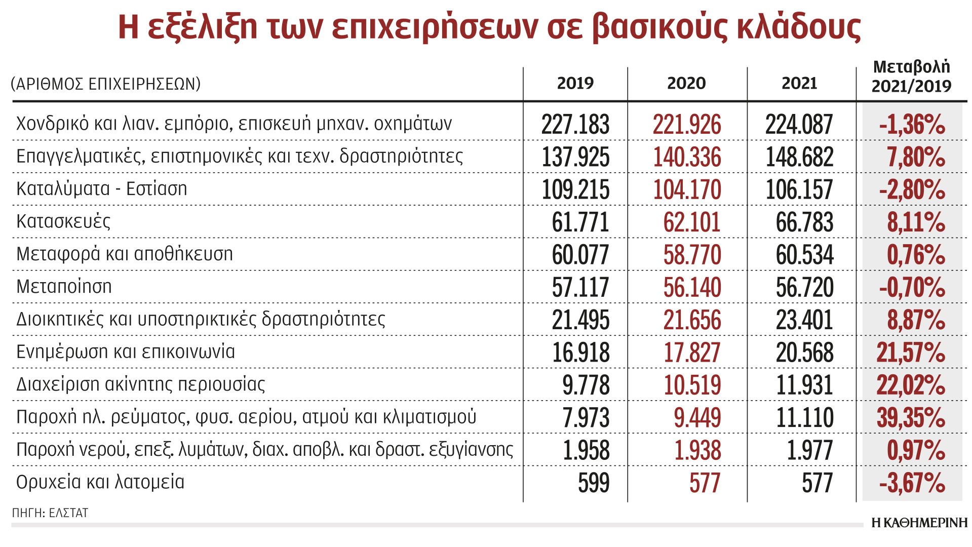 Οι κλάδοι με το μεγαλύτερο πλήθος επιχειρήσεων ήταν το χονδρικό και λιανικό εμπόριο με 224.087 επιχειρήσεις, οι οποίες αποτελούν το 25,4% του συνόλου των επιχειρήσεων, ο τομέας των επαγγελματικών, επιστημονικών και τεχνικών υπηρεσιών με 148.682 επιχειρήσεις, οι οποίες αποτελούν το 16,9%, και ακολουθούν οι υπηρεσίες παροχής καταλύματος και εστίασης με 106.157 επιχειρήσεις, που αντιστοιχούν σε ποσοστό 12%. Το 2019 ο αριθμός των εμπορικών επιχειρήσεων ήταν 227.183 και των επιχειρήσεων παροχής υπηρεσιών καταλύματος και εστίασης 109.215. Εάν, μάλιστα, δεν υπήρχαν τα μέτρα στήριξης για την αντιμετώπιση των επιπτώσεων της πανδημίας, θεωρείται σχεδόν βέβαιο ότι η «αιμορραγία» θα ήταν αρκετά μεγαλύτερη. Λιγότερες σε σύγκριση με το 2019 ήταν το 2021 και οι μεταποιητικές επιχειρήσεις, 56.720 έναντι 57.117, αποτελώντας το 6,4% του συνόλου των επιχειρήσεων.