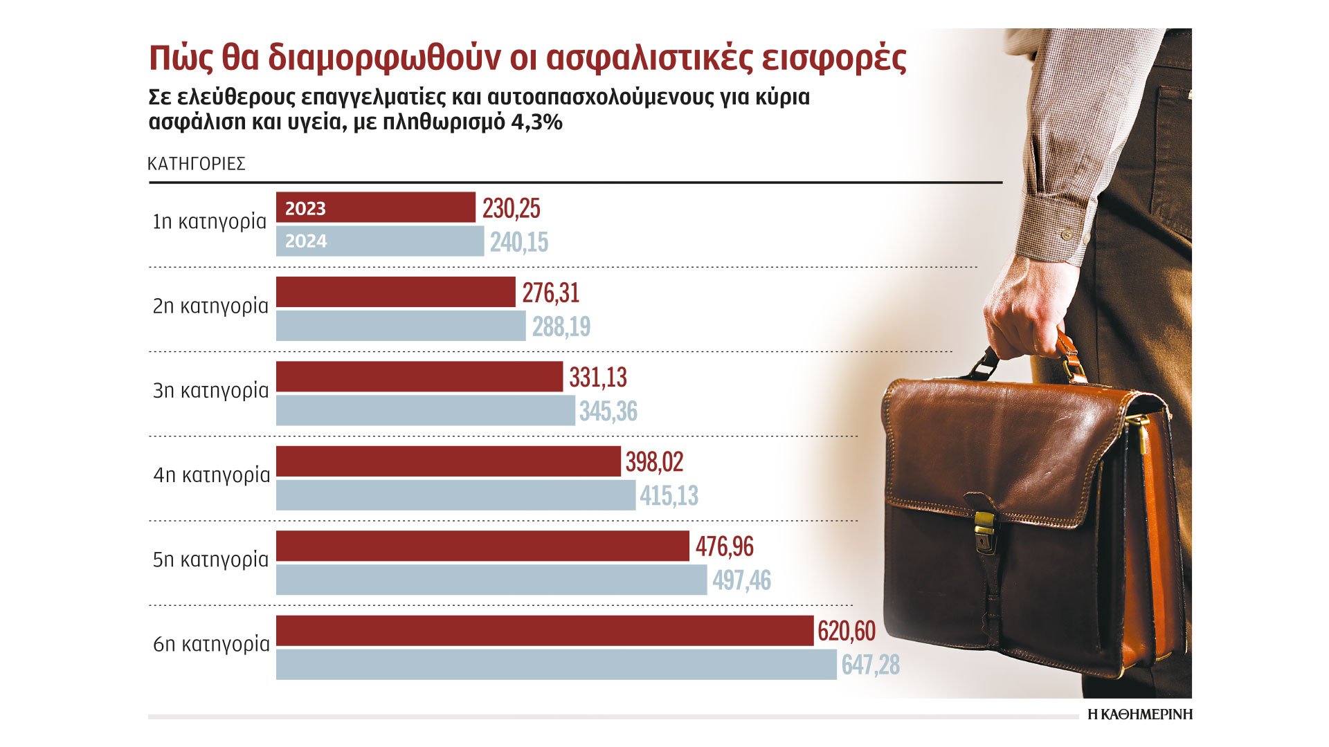 Αντίστοιχα, οι λίγοι που θα επιλέξουν και το 2024 την ανώτερη, 6η, ασφαλιστική κατηγορία, η μηνιαία επιβάρυνση θα ανέλθει σε 26,6 ευρώ για την κύρια ασφάλιση, με αποτέλεσμα να καταβάλλουν 647,28 ευρώ τον μήνα (από 620,6 ευρώ) στα οποία θα πρέπει να προστεθούν 10 ευρώ για την εισφορά ανεργίας. Για την επικούρηση, η 3η υψηλότερη κατηγορία θα ανέλθει στα 64 ευρώ, από 61,4 ευρώ (+2,6 ευρώ) και για το εφάπαξ στα 42,3 ευρώ, από 40,57 ευρώ (+1,7 ευρώ). Η συνολική μηνιαία επιπλέον επιβάρυνση λόγω του πληθωρισμού θα είναι, δηλαδή, 20,3 ευρώ τον μήνα ή 243,6 ευρώ τον χρόνο.