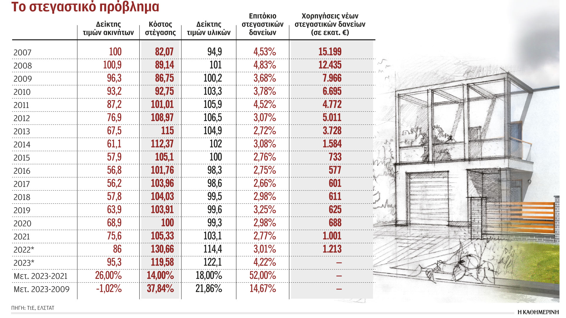 Τα οικοδομικά υλικά έχουν φτάσει σε τέτοια επίπεδα που ωθούν ήδη στην αναστολή νέων κατασκευών, ενώ οι χορηγήσεις στεγαστικών δανείων δεν μπορούν να συγκριθούν με την προ του 2010 περίοδο. Οσο για την κλιματική και την ενεργειακή κρίση, έχουν εκτοξεύσει το κόστος χρήσης της κύριας κατοικίας (ηλεκτροδότηση, θέρμανση, ψύξη κ.λπ.), ειδικά για τα παλαιότερα –άρα και φθηνότερα όσον αφορά στο κόστος κτήσης– ακίνητα.