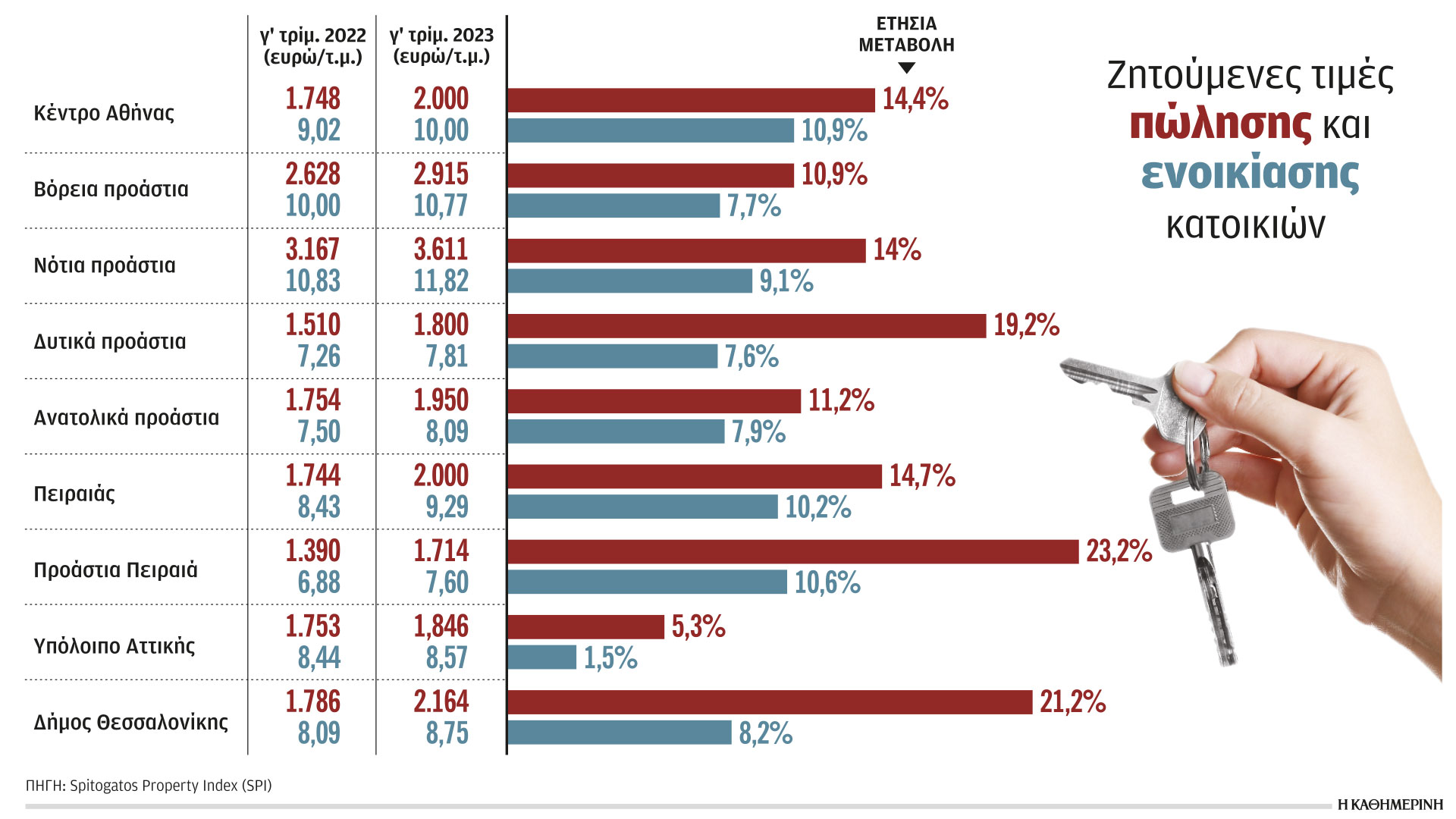 Αυξήσεις που άγγιξαν ακόμη και το 23,2% σε ετήσια βάση σημείωσαν οι μέσες ζητούμενες τιμές πώλησης κατοικιών στην Αττική κατά τη διάρκεια του φετινού τρίτου τριμήνου, παγιώνοντας την τάση έντονης επιτάχυνσης του ρυθμού ανόδου των τιμών που έχει διαμορφωθεί κατά τη διάρκεια των τελευταίων μηνών. Σύμφωνα με την επεξεργασία των στοιχείων του δείκτη τιμών Spitogatos Property Index (SPI) του ομώνυμου δικτύου ηλεκτρονικών αγγελιών, η μέση ζητούμενη τιμή πώλησης στην Αττική αυξήθηκε 13,6% κατά μέσον όρο, σε 2.230 ευρώ/τ.μ., σε σχέση με το τρίτο τρίμηνο του 2022, όταν η μέση τιμή διαμορφωνόταν σε 1.962 ευρώ/τ.μ. Στην πράξη, ένα διαμέρισμα 100 τ.μ. που πέρυσι πωλούνταν αντί 196.000 ευρώ, σήμερα κοστίζει 223.000 ευρώ, δηλαδή 27.000 ευρώ περισσότερα.