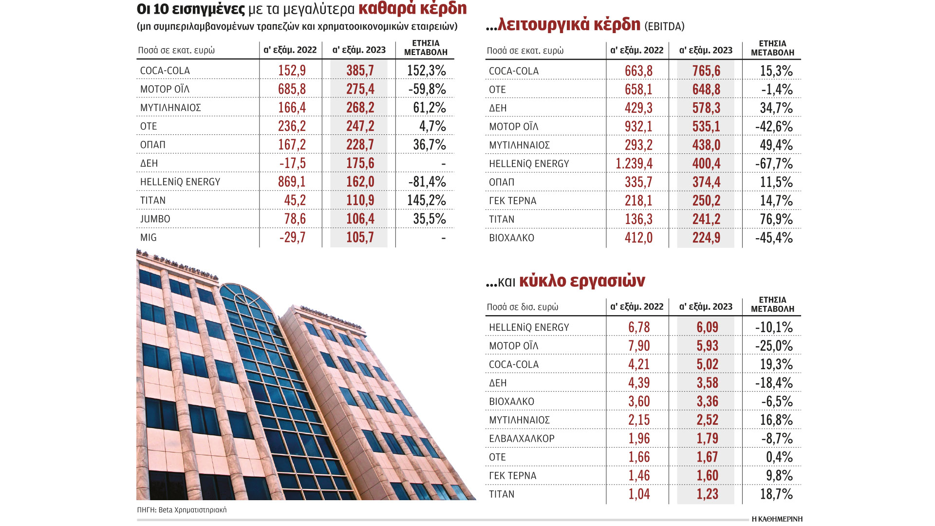 Ωστόσο, εάν αφαιρεθούν από το σύνολο οι κλάδοι των διυλιστηρίων και των τραπεζών, ο κύκλος εργασιών παρουσιάζει αύξηση της τάξης του 4,8% σε σχέση με την αντίστοιχη περίοδο πέρυσι και διαμορφώνεται στα 30,99 δισ. ευρώ, τα λειτουργικά κέρδη EBITDA είναι ενισχυμένα κατά 14,1% στα 5,41 δισ. ευρώ, ενώ η καθαρή κερδοφορία κινείται στα 2,55 δισ. ευρώ με άνοδο 58,5%.