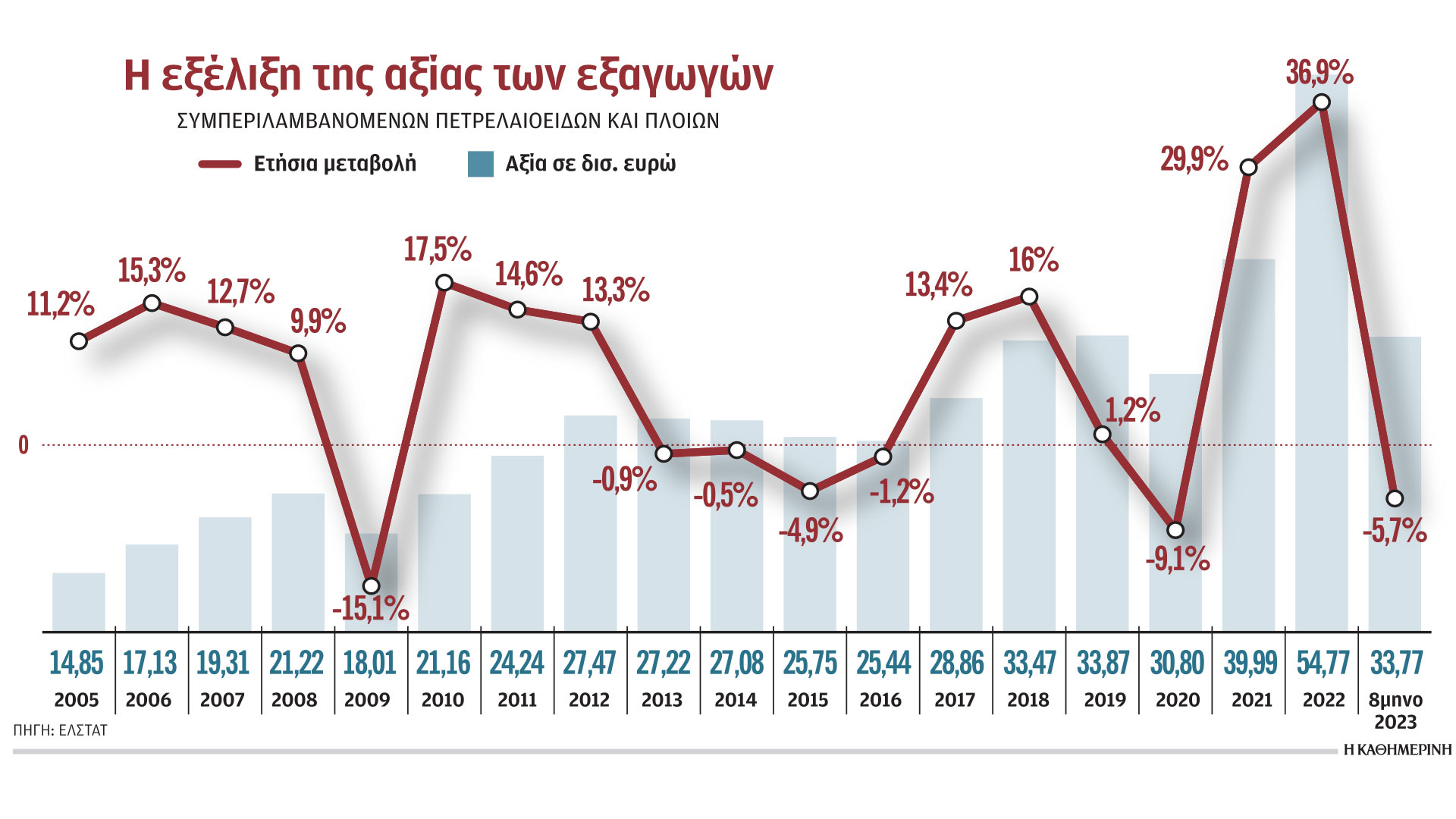 Δεδομένου, μάλιστα, ότι οι τιμές φέτος σε αρκετά προϊόντα, παρά την υποχώρησή τους σε σύγκριση με το 2022, παραμένουν σε πολύ υψηλότερα επίπεδα σε σύγκριση με την περίοδο πριν από το φθινόπωρο του 2021 και κυρίως πριν από την έναρξη του πολέμου στην Ουκρανία τον Φεβρουάριο του 2022, είναι εύκολο να αντιληφθεί κάποιος ότι η μικρή αύξηση της αξίας των εξαγωγών, χωρίς τα πετρελαιοειδή, σημαίνει δύο πράγματα: πρώτον, είναι πληθωριστική και δεύτερον, η πολύ μικρή ποσοστιαία αύξηση υποδηλώνει μείωση των εξαγόμενων ποσοτήτων, τουλάχιστον σε κάποιες κατηγορίες.