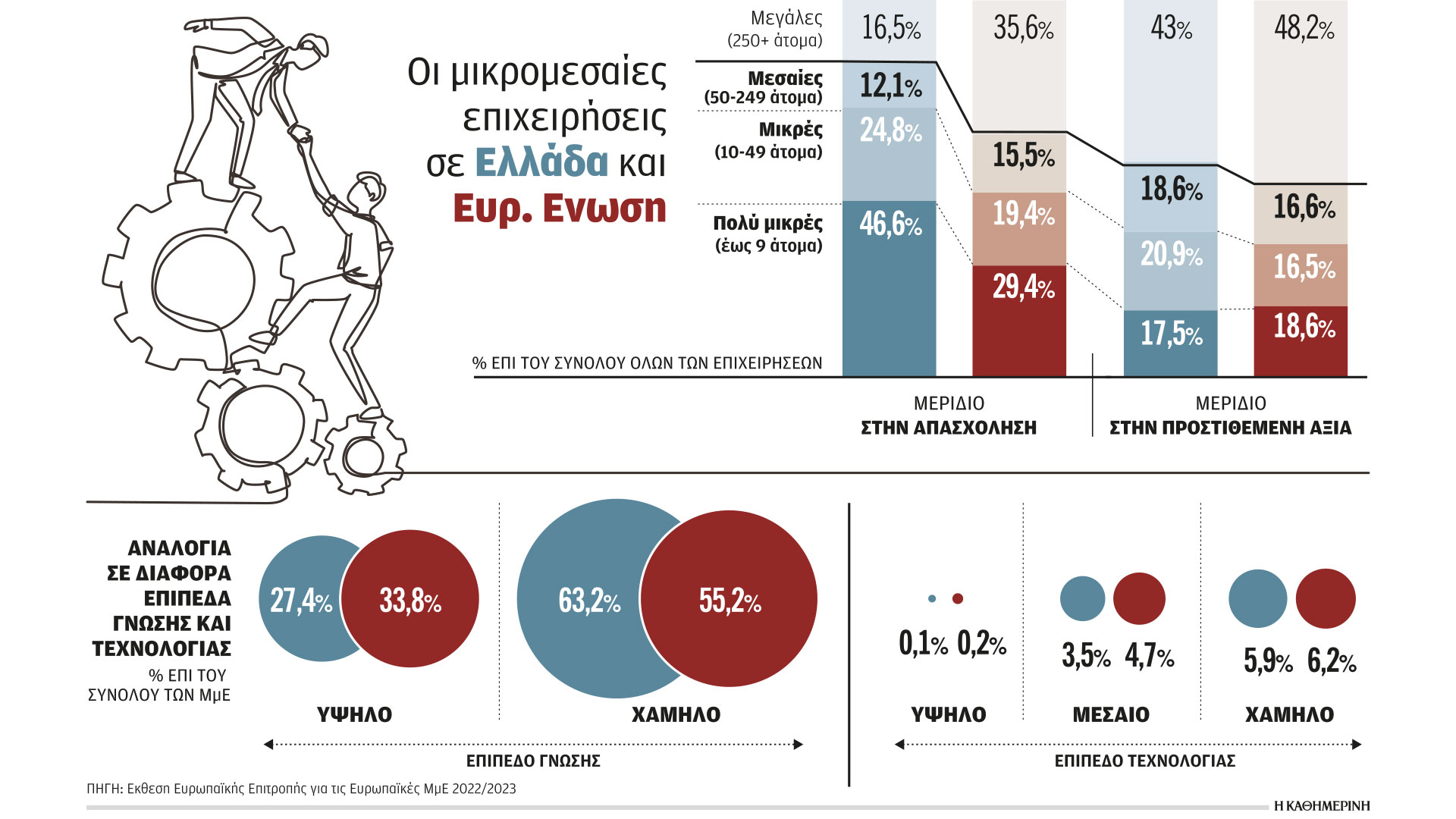Τα τελευταία διαθέσιμα στοιχεία της Eurostat, εξάλλου, δείχνουν ότι η παραγωγικότητα των πολύ μικρών επιχειρήσεων στην Ελλάδα αντιστοιχεί μόλις στο 17% αυτής των μεγάλων, ενώ στην Ε.Ε. αντιστοιχεί στο 48%.