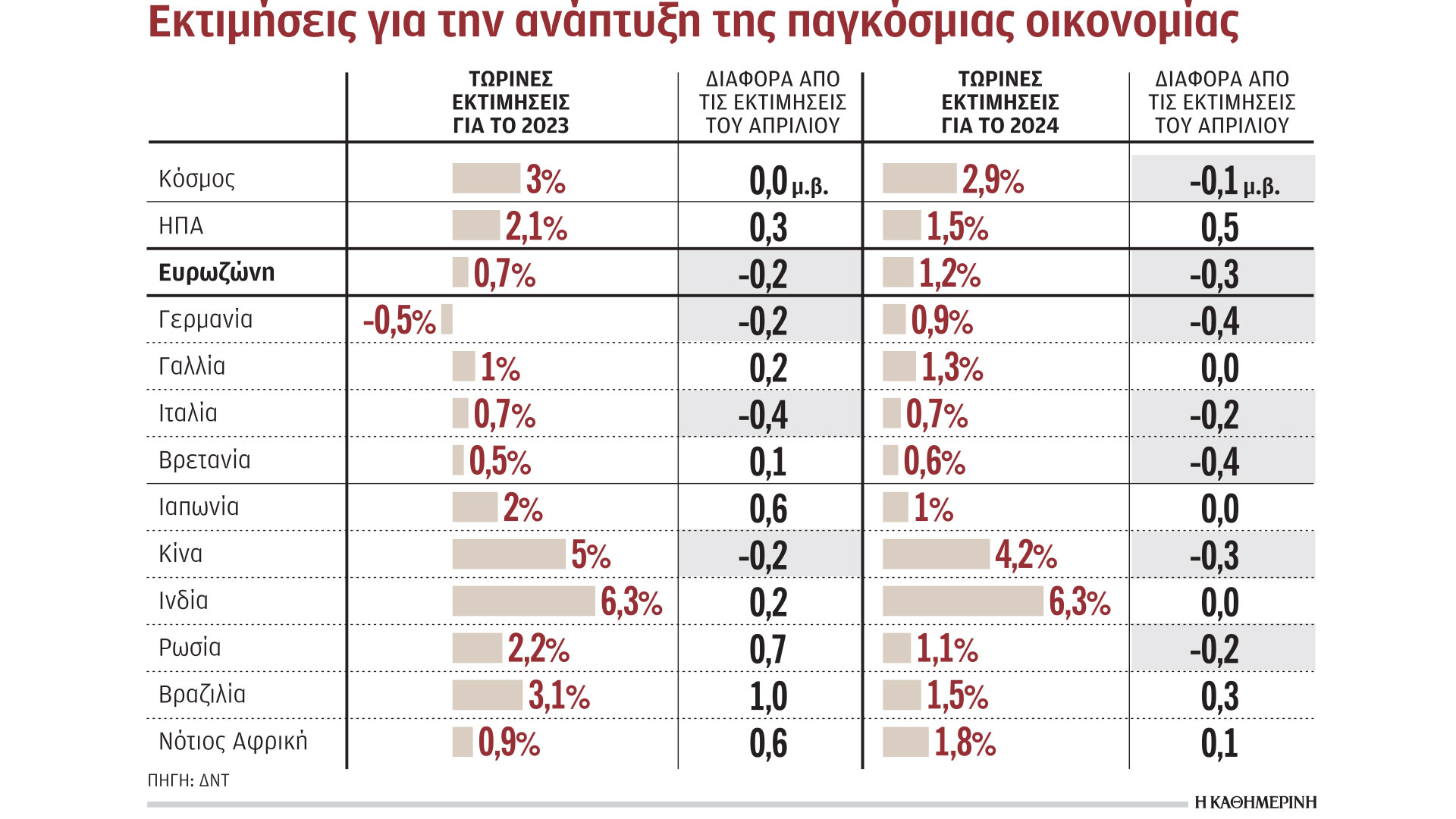 Επισημαίνει ιδιαιτέρως ότι οι οικονομίες έχουν επιδείξει αξιοσημείωτη αντοχή στα συνεπακόλουθα του πολέμου, στην ενεργειακή κρίση και στην εκτόξευση των τιμών των τροφίμων, όπως επίσης και στην επιθετική στροφή των κεντρικών τραπεζών σε περιοριστική νομισματική πολιτική. Οι προβλέψεις του για την ανάπτυξη είναι πιο αισιόδοξες για ορισμένες χώρες σε σύγκριση με τις αμέσως προηγούμενες εκτιμήσεις, όπως, για παράδειγμα, στην περίπτωση της αμερικανικής οικονομίας που, σε αντίθεση με την Ευρωζώνη, αποδεικνύεται ιδιαιτέρως ανθεκτική στις αυξήσεις των επιτοκίων. Αναβαθμίζει, έτσι, την πρόβλεψή του για την ανάπτυξη της μεγαλύτερης οικονομίας στον κόσμο κατά 0,3 εκατοστιαίες μονάδες, στο 2,1%, ενώ υποβαθμίζει εκείνη για την Ευρωζώνη κατά 0,2 εκατοστιαίες μονάδες, στο 0,7%.