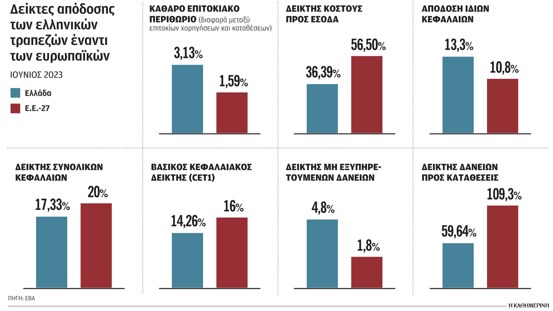 Η βελτίωση της βασικής πηγής κερδοφορίας των ελληνικών τραπεζών είχε αποτέλεσμα και την υψηλή κίνηση του δείκτη απόδοσης ιδίων κεφαλαίων, που έφθασε πάνω από τον μέσο όρο των ευρωπαϊκών τραπεζών και συγκεκριμένα στο 13,3% έναντι 10,8% στην Ε.Ε. Να σημειωθεί ότι ο δείκτης απόδοσης ιδίων κεφαλαίων των ελληνικών τραπεζών υποχώρησε σε σχέση με τα επίπεδα του 2022 (το γ΄ τρίμηνο του 2022 είχε διαμορφωθεί στο 16%), όταν η κύρια πηγή κερδοφορίας ήταν τα χρηματοοικονομικά κέρδη και πλέον στηρίζεται σε πιο υγιή βάση.