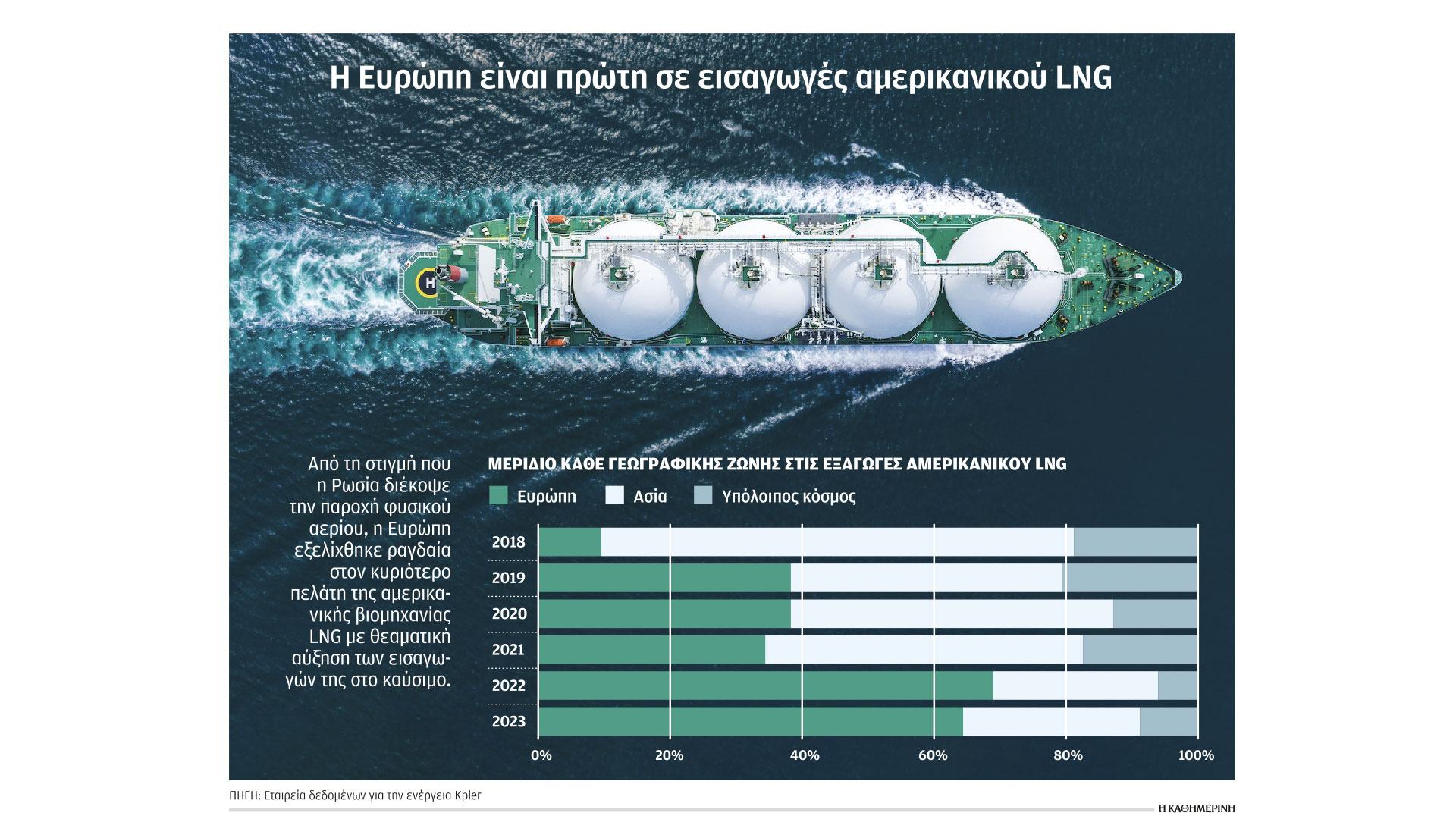 Το φθινόπωρο του 2021 η Ευρώπη βρισκόταν για πρώτη φορά αντιμέτωπη με μια συστηματική μείωση της ροής του φυσικού αερίου από τη Ρωσία, η οποία, όπως απεδείχθη εκ των υστέρων, ετοιμαζόταν να εισβάλει στην Ουκρανία λίγους μήνες αργότερα και να διακόψει πλήρως την παροχή του καυσίμου στη Γηραιά Ηπειρο. Εκτοτε η Ευρώπη έχει αποδυθεί σε μια αγωνιώδη εκστρατεία με στόχο την απεξάρτησή της από τον ενεργειακά πλούσιο γείτονά της, μια εκστρατεία που τη μετέτρεψε στην καλύτερη πελάτισσα της αμερικανικής βιομηχανίας υγροποιημένου φυσικού αερίου (LNG), την οδήγησε σε συμφωνίες παροχής φυσικού αερίου με χώρες της Μέσης Ανατολής και της Αφρικής, όπως το Κατάρ και την Αλγερία, και οδήγησε ορισμένες ευρωπαϊκές χώρες στην αγορά τερματικών σταθμών LNG. Στο μεταξύ και προτού κλείσει κάθε «παράθυρο ευκαιρίας», χώρες και βιομηχανίες της Ευρώπης είχαν σπεύσει να αγοράσουν όσο περισσότερο ρωσικό αέριο και πετρέλαιο μπορούσαν. Κατόρθωσαν, έτσι, να έχουν σχετική πληρότητα στους ταμιευτήρες τους, τους οποίους θα χρειαστεί όμως να ανατροφοδοτηθούν.