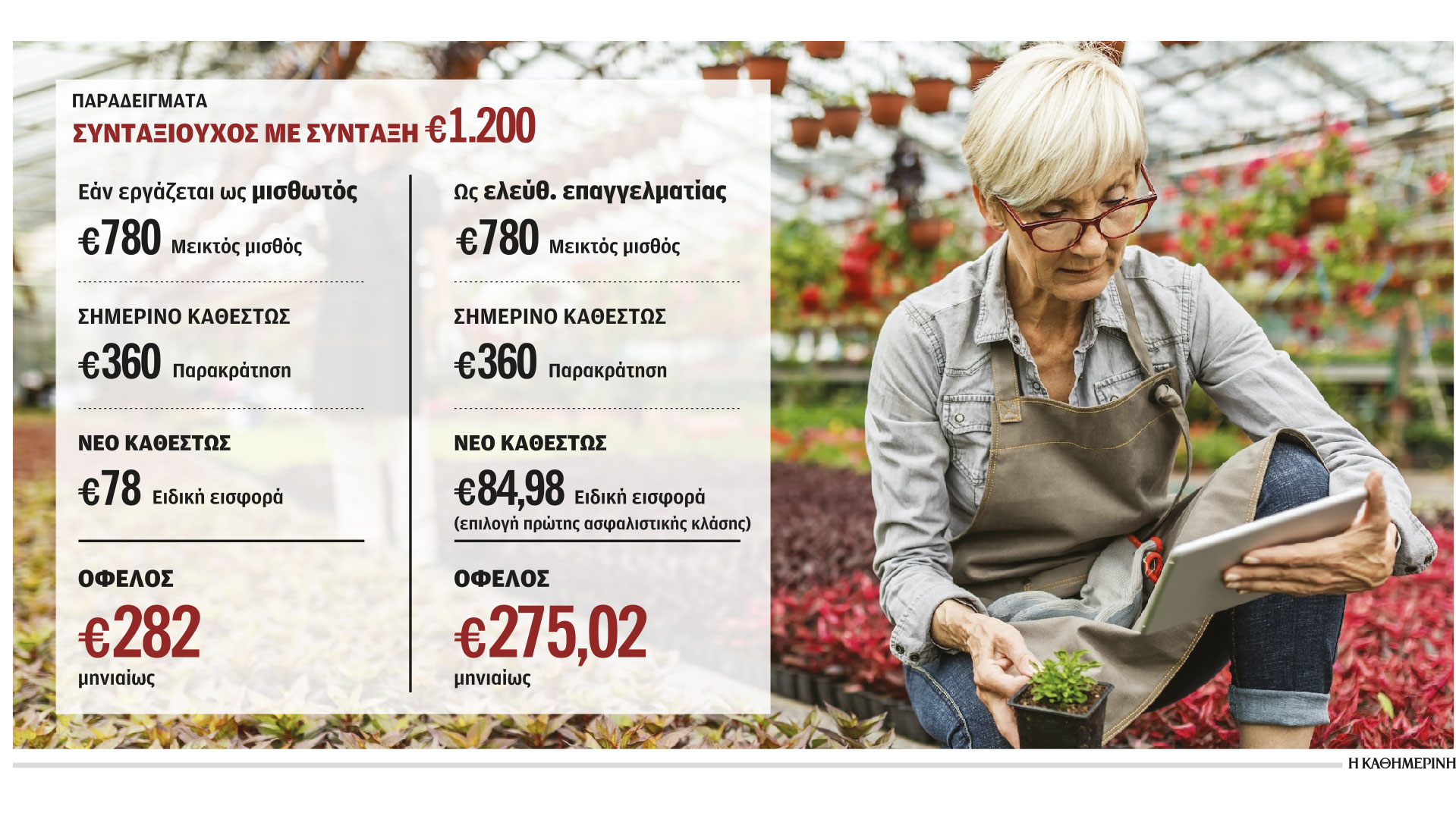 Ετσι, για παράδειγμα, συνταξιούχος που εργάζεται και δικαιούται σύνταξη ύψους 1.200 ευρώ, αντιμετωπίζει παρακράτηση ύψους 360 ευρώ με το ισχύον καθεστώς. Εάν εργάζεται ως μισθωτός, με μεικτό μηνιαίο μισθό 780 ευρώ, θα λαμβάνει ολόκληρη τη σύνταξή του και θα του παρακρατείται από τον μισθό ειδική εισφορά ύψους 78 ευρώ. Συνεπώς, θα έχει όφελος 282 ευρώ μηνιαίως.