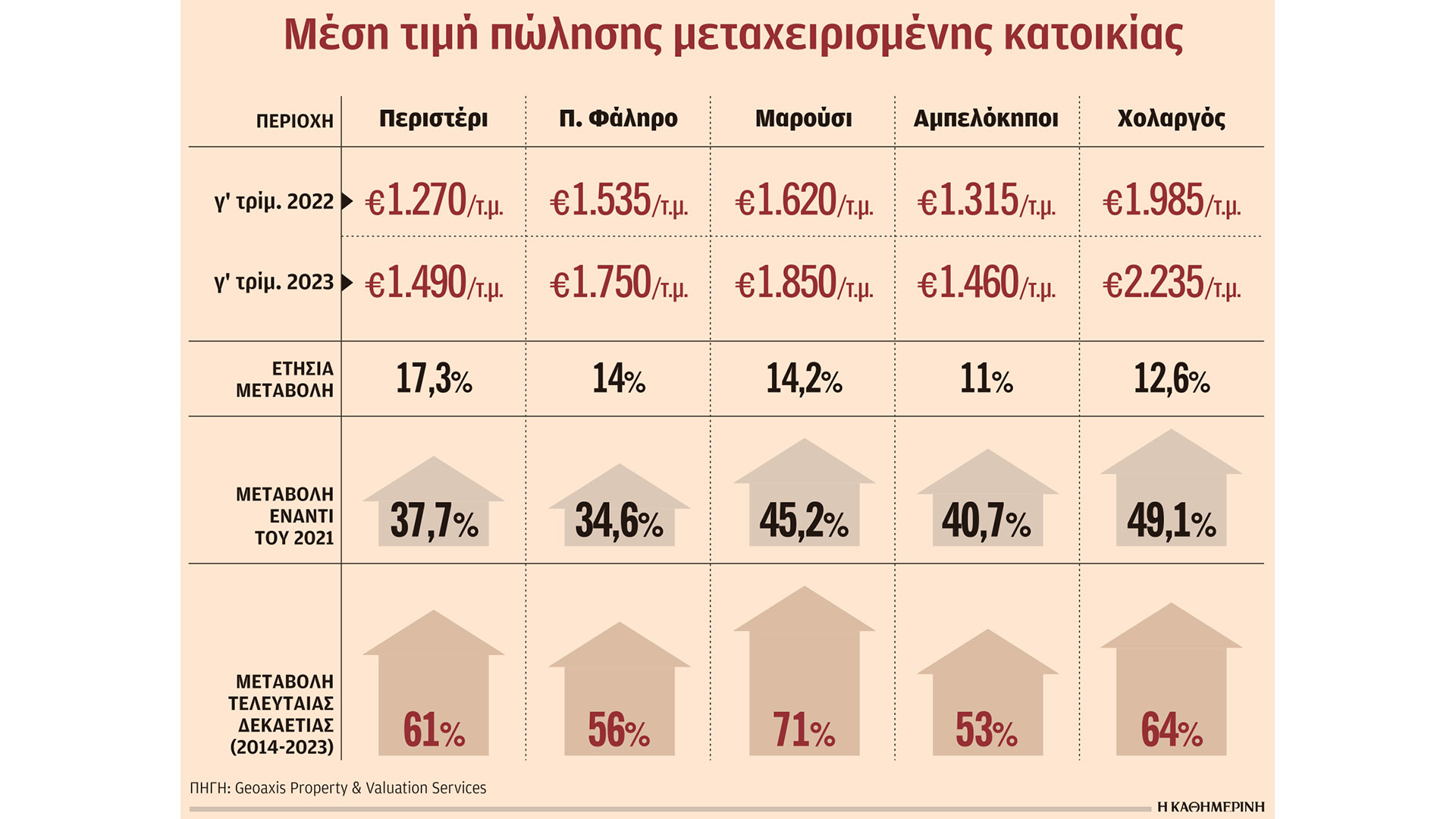 Οπως προκύπτει από τα στοιχεία τιμών της Geoaxis, η οποία επικεντρώνει την ανάλυσή της σε πέντε αντιπροσωπευτικές περιοχές της Αττικής, η μεγαλύτερη άνοδος των τιμών κατά τη διετία 2021-2023 εντοπίζεται στα παλαιά διαμερίσματα του Χολαργού. Ενα τέτοιο ακίνητο κοστίζει σήμερα 2.235 ευρώ/τ.μ., έχοντας καταγράψει αύξηση κατά 49% (και 12,6% σε ετήσια βάση). Εντυπωσιακό είναι και το «ράλι» τιμών στο Μαρούσι, όπου η μέση τιμή διαμορφώνεται σήμερα σε 1.850 ευρώ/τ.μ. (για μεταχειρισμένα ακίνητα ασφαλώς), έχοντας καταγράψει αύξηση κατά 45% σε σχέση με το 2021 αλλά και 71% έναντι του 2014. Επισημαίνεται ότι οι παραπάνω τιμές αφορούν τυπικά ακίνητα σε κάθε περιοχή και όχι κατασκευές υψηλών προδιαγραφών ή κατοικίες που βρίσκονται σε ιδιαίτερα προνομιακά σημεία. Τέτοιου είδους κατοικίες πωλούνται ακόμη και 25% περισσότερο από τα τυπικά ακίνητα.