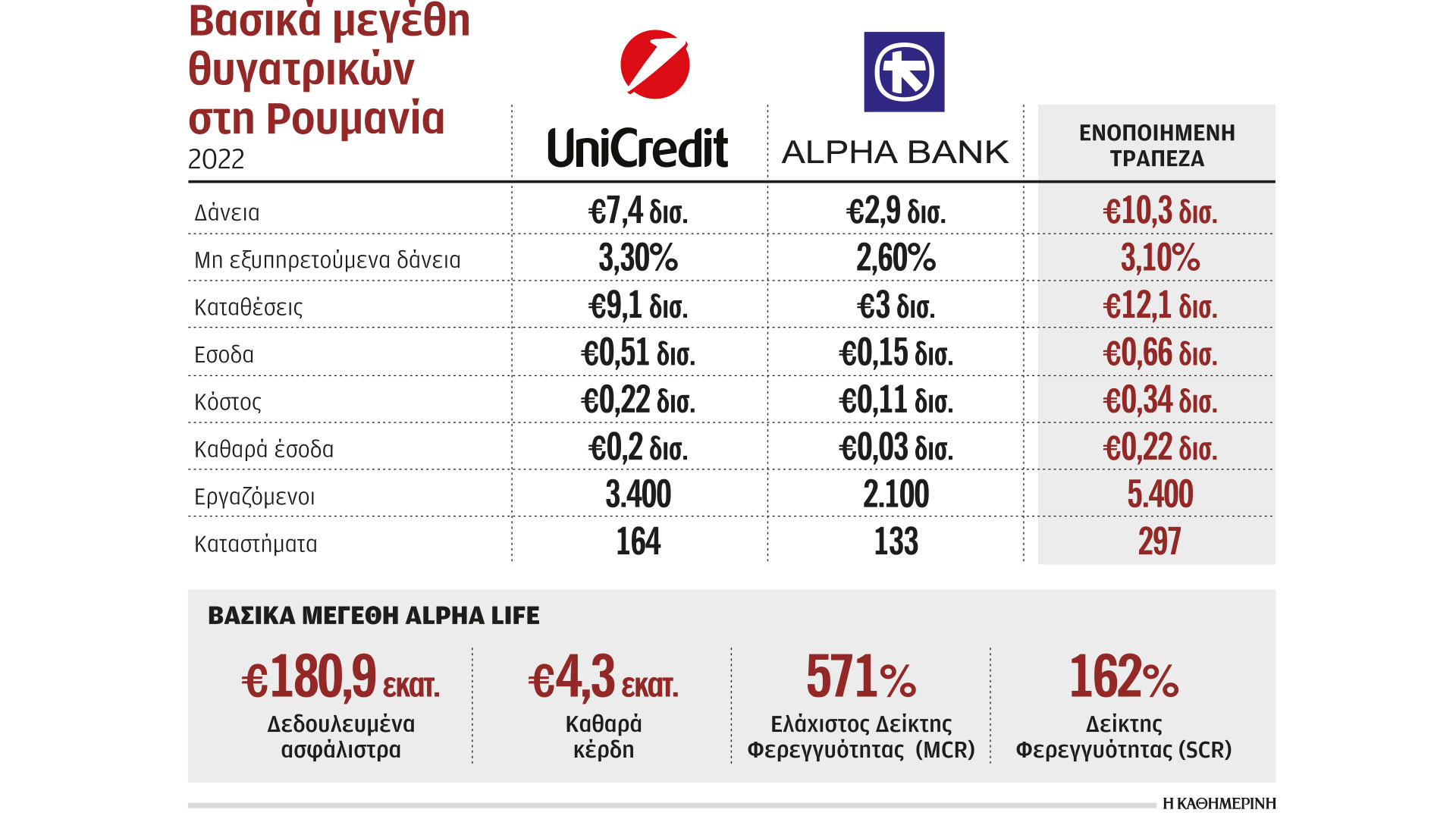 Οπως ανακοινώθηκε, η ενιαία τράπεζα που θα προκύψει από τη συγχώνευση θα αποτελέσει την 3η μεγαλύτερη τράπεζα στη Ρουμανία, με συνολικό μερίδιο αγοράς 13%, έναντι 17% της Banca Transilvania και της BCR που ακολουθεί με 14%. Η νέα τράπεζα στην οποία η Alpha θα διατηρήσει το 9,9% –εισπράττοντας από την πώληση 300 εκατ. ευρώ– θα αποκτήσει σύμφωνα με τις διοικήσεις των δύο μερών την κρίσιμη μάζα για να αναπτυχθεί περαιτέρω μέσα από τις συμπληρωματικές εργασίες που εξασφαλίζει η ενοποίηση των δύο τραπεζών στην επιχειρηματική και λιανική τραπεζική.