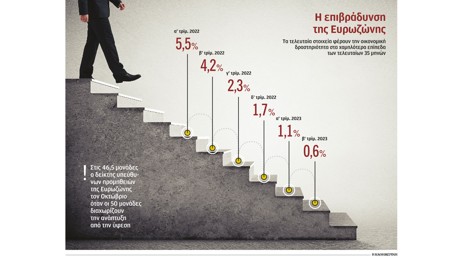 Από τον Φεβρουάριο του 2022, η Ευρωζώνη έχει διανύσει μια επώδυνη πορεία στην προσπάθειά της να υποκαταστήσει με κάθε κόστος το ρωσικό φυσικό αέριο, έχει αντιμετωπίσει την αναπόφευκτη ενεργειακή κρίση που έπληξε τις γερμανικές βιομηχανίες, έχει δαπανήσει πολλά για να διασφαλίσει εναλλακτικούς προμηθευτές ενέργειας και ξεκινάει ένα δύσκολο χειμώνα. Αρχισε το τελευταίο τρίμηνο του έτους με το κόστος του δανεισμού να βρίσκεται πλέον στο 4% και τις διαβεβαιώσεις της Κριστίν Λαγκάρντ πως θα παραμείνει σε αυτά τα υψηλά επίπεδα για πολύ καιρό. Οπως έχει διακηρύξει η ΕΚΤ σε όλους τους τόνους, υπάρχει πολύς δρόμος ακόμη μέχρις ότου υποχωρήσει ο πληθωρισμός στον στόχο του 2%, αν και οι αλλεπάλληλες αυξήσεις των επιτοκίων έχουν οδηγήσει σε αποκλιμάκωσή του στο 4,3%.