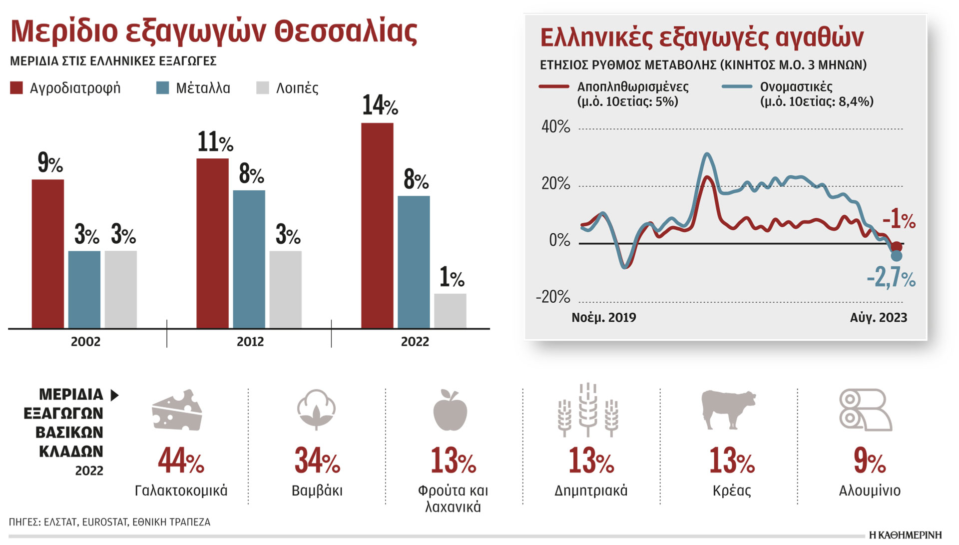 Κατά το τελευταίο τετράμηνο του 2023, που ξεκίνησε με την κακοκαιρία «Daniel», εκτιμάται ότι οι εκτεταμένες καταστροφές στη Θεσσαλία θα στερήσουν από τις ελληνικές εξαγωγές μισή ποσοστιαία μονάδα, ενώ η αναμενόμενη μειωμένη παραγωγή ελαιολάδου και επιτραπέζιων ελιών εκτιμάται ότι θα στερήσει δύο ποσοστιαίες μονάδες. Αξίζει να σημειωθεί ότι με περίπου 2 δισ. ευρώ εξαγωγές ετησίως, η Θεσσαλία καλύπτει το 6% των ελληνικών εξαγωγών, διαγράφοντας ανοδική πορεία την τελευταία 20ετία (από μερίδιο 4% το 2000). Παρά την επιβράδυνση δυναμικής, τα ελληνικά προϊόντα κατά το τελευταίο τρίμηνο κατόρθωσαν να αυξήσουν οριακά το μερίδιό τους στην Ευρώπη (0,56%, έναντι 0,55%) στο αντίστοιχο διάστημα του 2022. Τα τρόφιμα σημείωσαν την υψηλότερη αύξηση μεριδίου (+0,2 ποσοστιαία μονάδα), με οδηγό το ελαιόλαδο (φτάνοντας μερίδιο 12,3%, από 7,3% ένα χρόνο πριν) και το σκληρό σιτάρι (1,4%, από 1%, αντιστοίχως). Ωστόσο, η Ελλάδα απώλεσε μερίδια στις διεθνείς αγορές στην κατηγορία των ελιών, αλλά και των ψαριών.