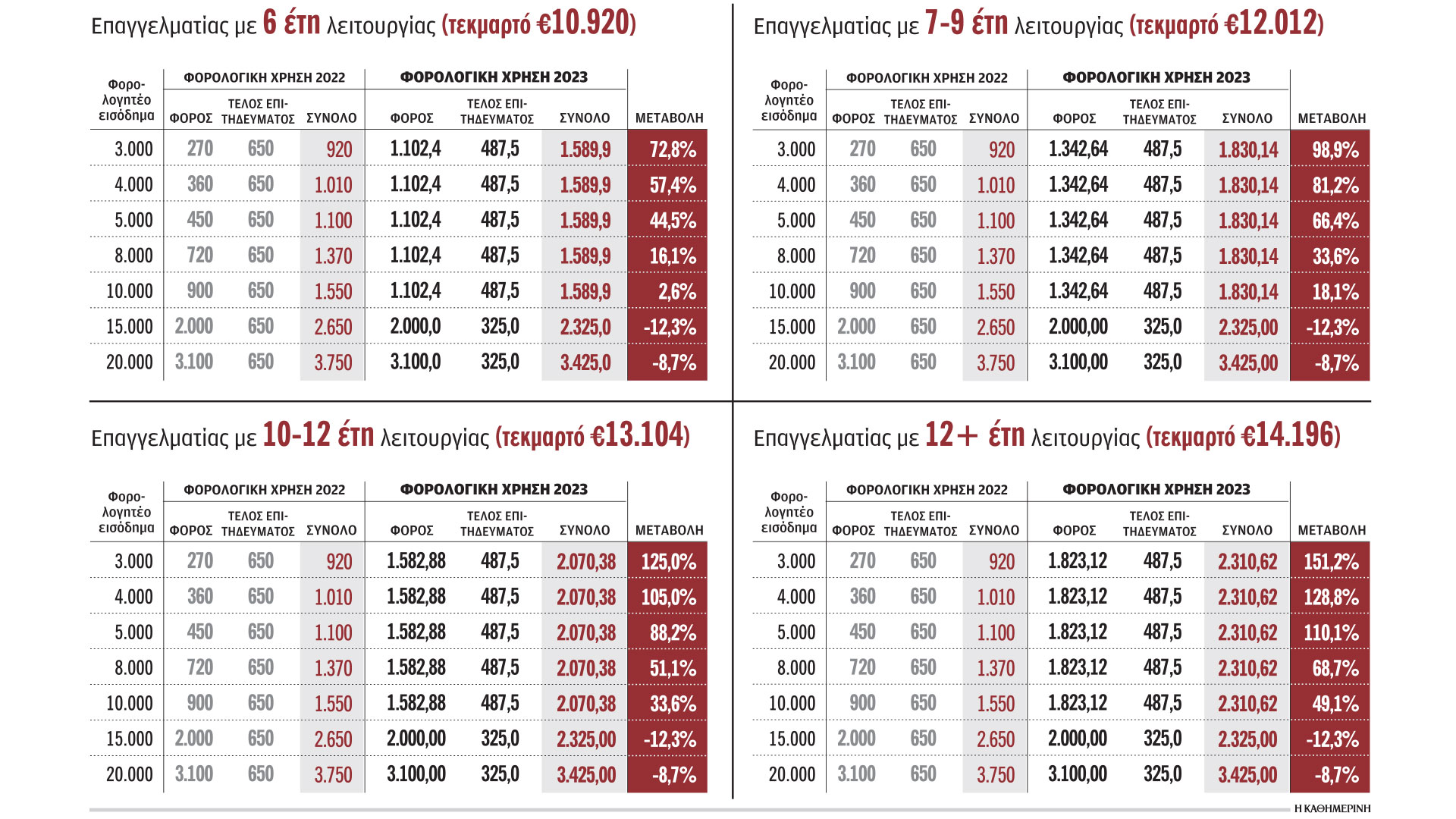 Σύμφωνα με το σχέδιο του οικονομικού επιτελείου, το τεκμαρτό εισόδημα των επαγγελματιών θα διαμορφωθεί ως εξής για τη χρήση του 2023: