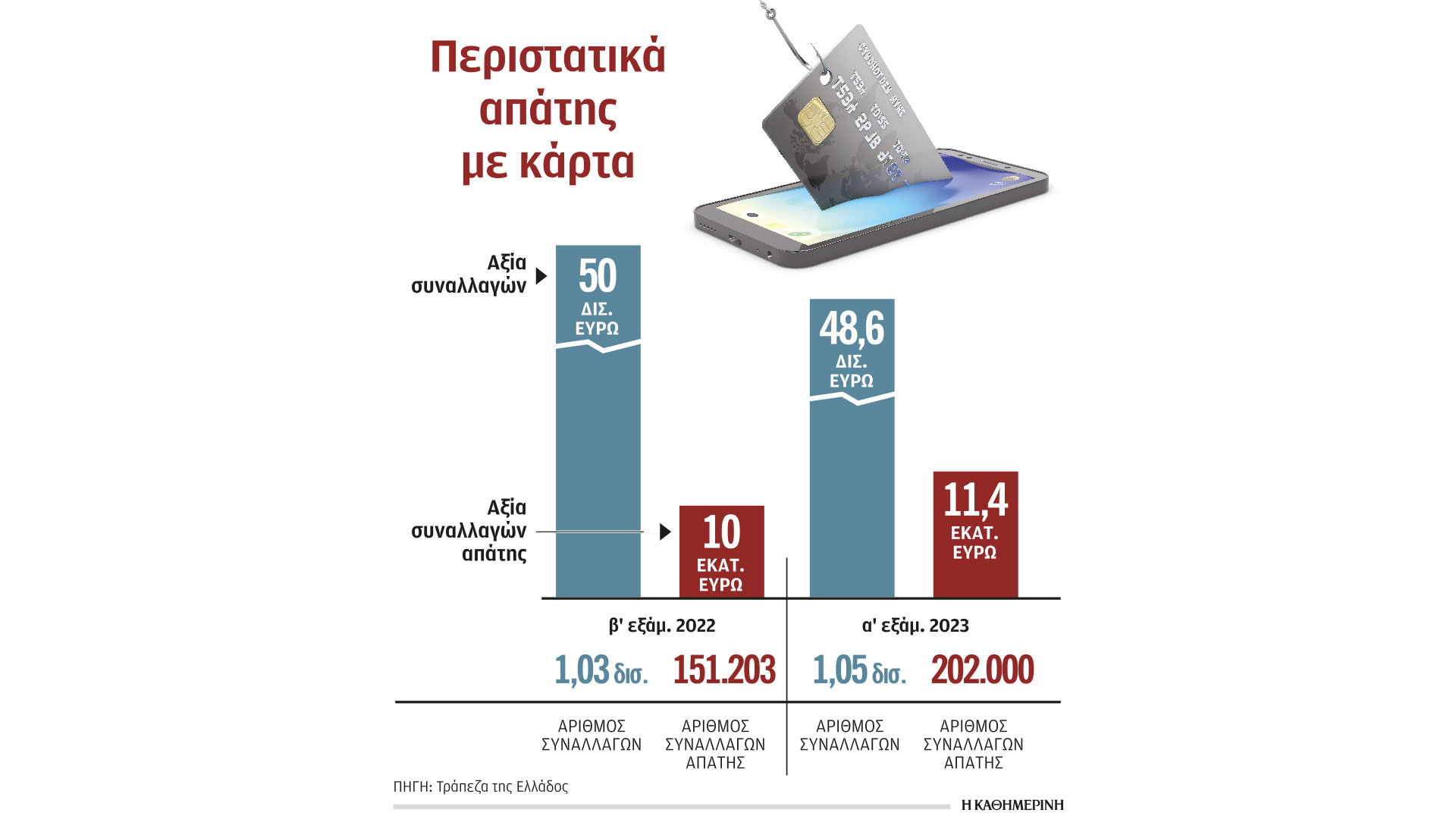• 202.000 περιστατικά απάτης συνολικής αξίας 12,5 εκατ. ευρώ σε συναλλαγές με κάρτες το α΄ εξάμηνο του 2023 έναντι 151.203 περιστατικών απάτης συνολικής αξίας 10 εκατ. ευρώ το β΄ εξάμηνο του 2022.