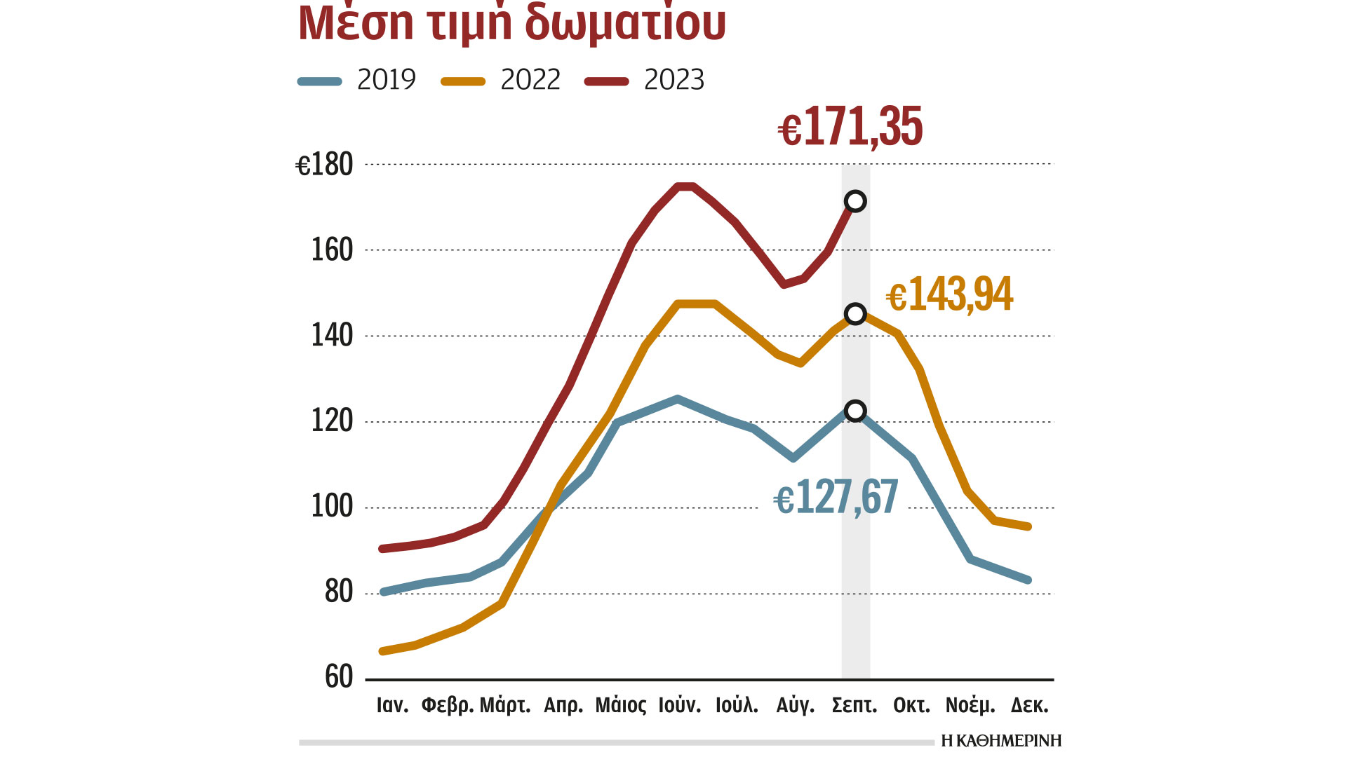 Σύμφωνα με τα τελευταία στοιχεία κίνησης και απόδοσης των ξενοδοχείων της Αθήνας και της Αττικής, που συγκέντρωσε η Ενωση Ξενοδόχων Αθηνών Αττικής και Αργοσαρωνικού (ΕΞΑΑΑ), η μέση τιμή δωματίου (ADR), τον Σεπτέμβριο έφτασε τα 171,35 ευρώ έναντι των 143,94 ευρώ του Σεπτεμβρίου του 2022 και των 123,67 ευρώ του Σεπτεμβρίου του 2019. Σημειώθηκε δηλαδή αύξηση της τάξης του 19% και του 38,6% έναντι του Σεπτεμβρίου του 2022 και του 2019 αντίστοιχα.