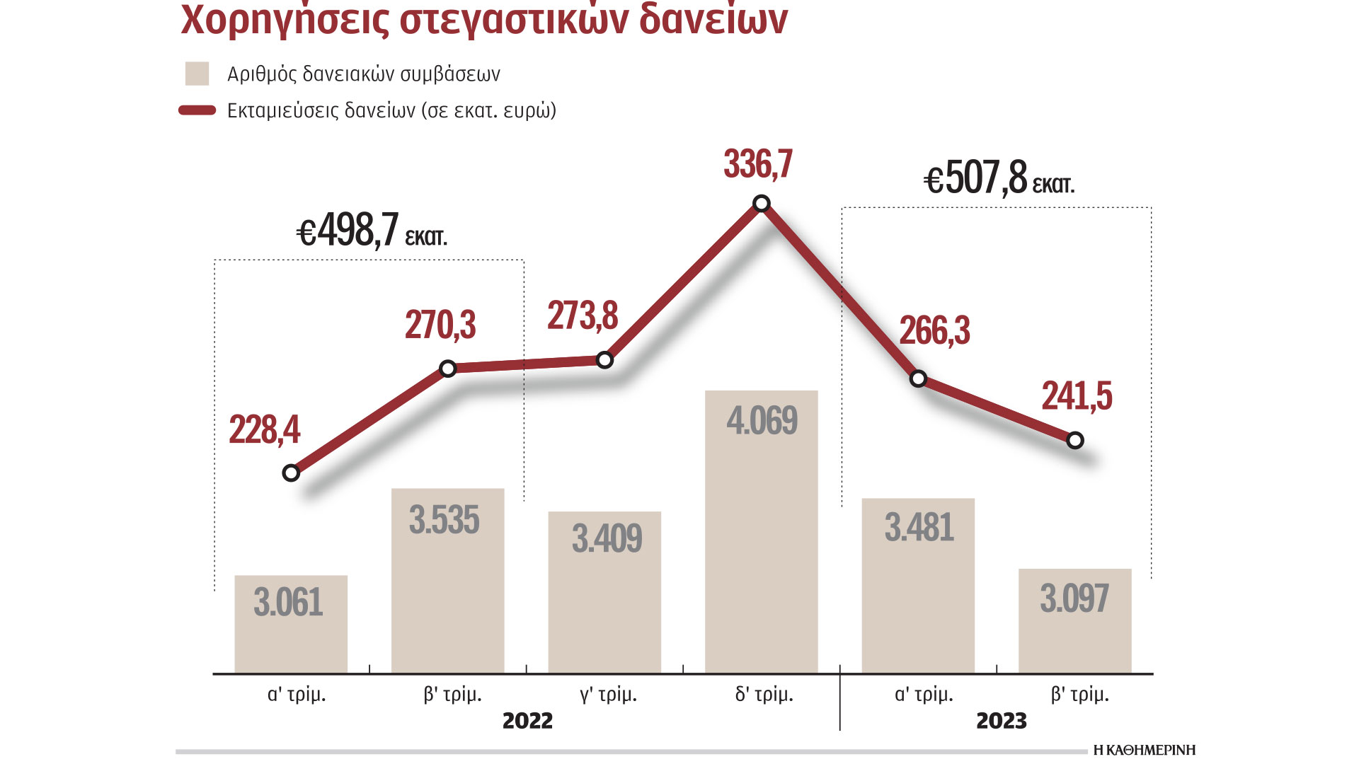Η άνοδος των επιτοκίων βλάπτει σοβαρά τη στεγαστική πίστη, επηρεάζοντας τόσο τη ζήτηση όσο και την προσφορά για στεγαστικά δάνεια. Αυτό προκύπτει από τα στοιχεία της ΤτΕ με βάση τα οποία οι εκταμιεύσεις στεγαστικών δανείων υποχώρησαν το β΄ τρίμηνο του 2023 κατά 10,7%, ενώ το ίδιο διάστημα μεγαλύτερη υποχώρηση της τάξης του 12,4% παρουσίασε και ο αριθμός των δανείων που χορηγήθηκαν. Συγκεκριμένα, οι εκταμιεύσεις δανείων υποχώρησαν από τα 270,3 εκατ. ευρώ στα 241,5 εκατ. ευρώ, ενώ ο αριθμός των δανειακών συμβάσεων που υπεγράφησαν περιορίστηκε από 3.535 σε 3.097.