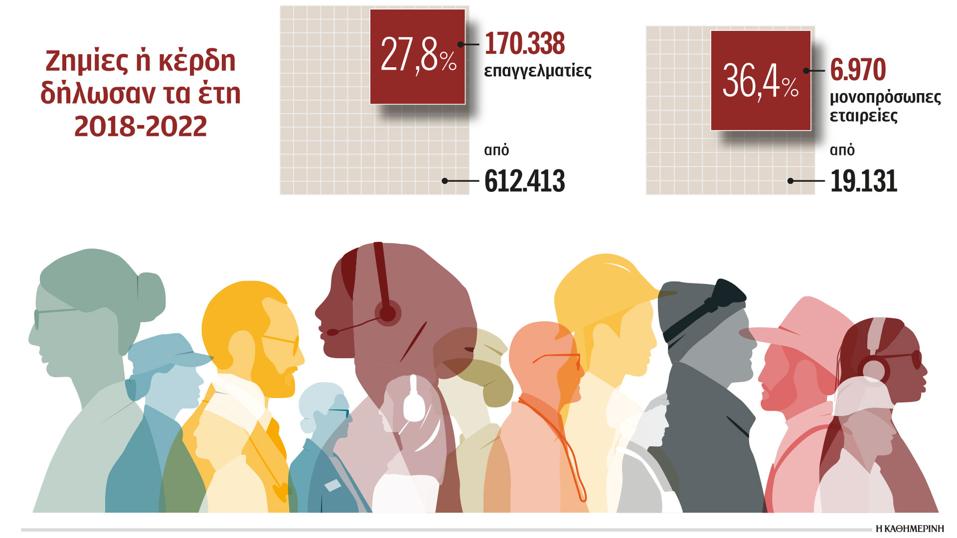 Σύμφωνα με τα στοιχεία της Ανεξάρτητης Αρχής Δημοσίων Εσόδων και του υπουργείου Οικονομικών, από τις 19.131 μονοπρόσωπες εταιρείες που έχουν κάνει έναρξη πριν από το 2019 και έχουν υποβάλει και για τα πέντε φορολογικά έτη (2018 έως 2022) δήλωση φόρου εισοδήματος – έντυπο Ν, οι 6.970 δηλώνουν γι’ αυτά τα συνεχόμενα πέντε έτη μηδενικά κέρδη ή ζημίες. Επίσης, από τους 612.413 επαγγελματίες που έχουν κάνει έναρξη πριν από το 2019 και έχουν υποβάλει και για τα πέντε φορολογικά έτη (2018 έως 2022) δήλωση φόρου, οι 170.338 δηλώνουν γι’ αυτά τα συνεχόμενα έτη μηδενικά κέρδη ή ζημίες.