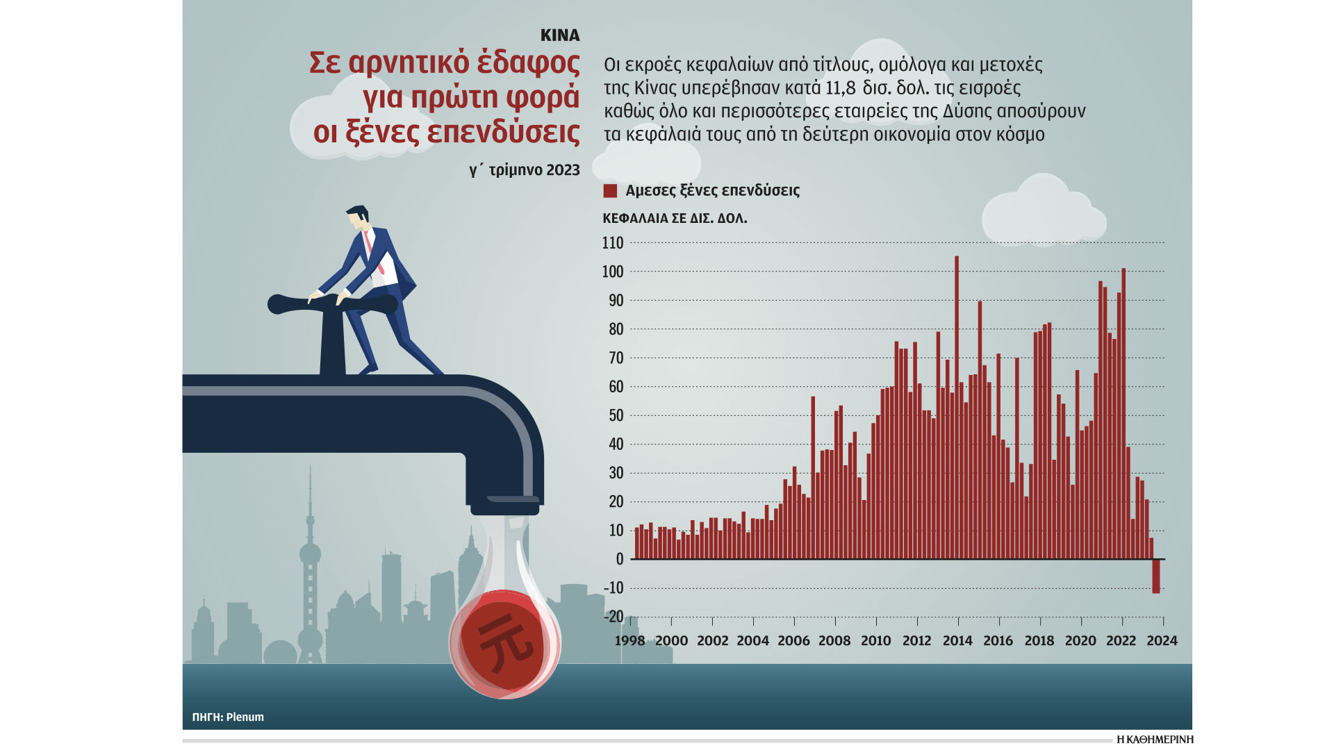 Την ίδια στιγμή, εξάλλου, η Κίνα χάνει μεγάλο μέρος από τις άμεσες ξένες επενδύσεις, που εισέρρεαν μαζικά στα ταμεία της τα περασμένα χρόνια. Σύμφωνα με επίσημα στοιχεία της Κίνας, τα δύο τελευταία τρίμηνα του 2022 και τα δύο πρώτα τρίμηνα του 2023 οι άμεσες ξένες επενδύσεις στην Κίνα ήταν κατά 78% μικρότερες από τις αντίστοιχες ένα χρόνο νωρίτερα. Το γ΄ τρίμηνο του 2023, άλλωστε, έφτασε για πρώτη φορά από το 1998 να παρουσιάζει έλλειμμα άμεσων ξένων επενδύσεων, αφού οι εκροές υπερέβησαν τις εισροές κατά 11,8 δισ. δολ. Από τα μέσα του περασμένου έτους, ξένες εταιρείες απέσυραν από την Κίνα συνολικά 160 δισ. δολ. Ανάμεσά τους η καναδική εταιρεία ηλεκτρονικών αεροδιαστημικής Firan Technology Group, που απέσυρε από την Κίνα περίπου 1,6 εκατ. δολ. Ομοίως η ελβετική εταιρεία υλικών τεχνολογίας Oerlikon ανακοίνωσε ότι μέσα στο 2022 απέσυρε από την Κίνα 276 εκατ. δολ. και η αμερικανική Chart Industries, που απέσυρε από την Κίνα 35 εκατ. δολάρια.