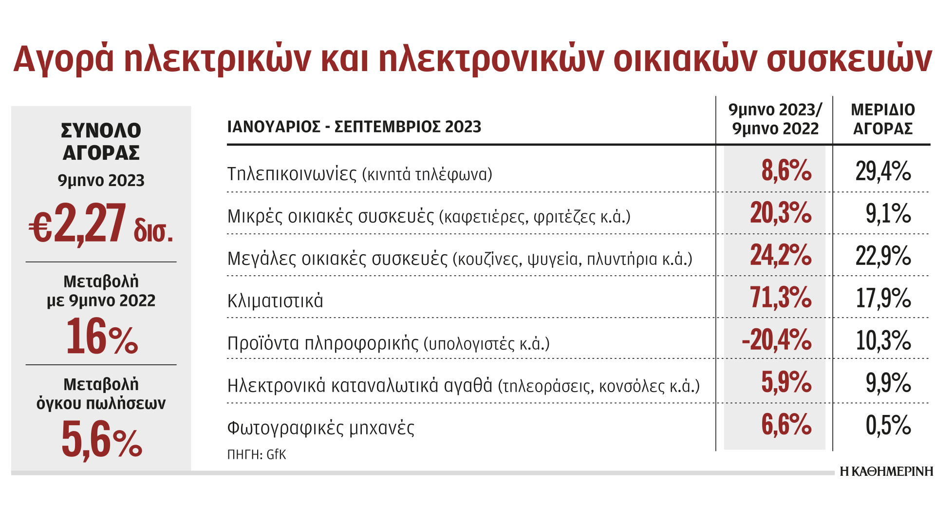 Σύμφωνα με τα στοιχεία της GfK, στο εννεάμηνο Ιανουαρίου – Σεπτεμβρίου 2023 η αξία της αγοράς ηλεκτρικών και ηλεκτρονικών οικιακών συσκευών διαμορφώθηκε σε 2,27 δισ. ευρώ, ενισχυμένη κατά 16% σε σύγκριση με το αντίστοιχο περυσινό διάστημα. Η αύξηση αυτή, μάλιστα, δεν ήταν μόνο πληθωριστική, καθώς καταγράφηκε και αύξηση 5,6% του όγκου πωλήσεων. Τούτο συνδέεται με την έντονη οικοδομική δραστηριότητα, την αυξημένη τουριστική κίνηση, αλλά και το πρόγραμμα «Ανακυκλώνω – Αλλάζω Συσκευή», πρόγραμμα το οποίο έληξε πριν από μερικές εβδομάδες. Δεν είναι τυχαίο ότι η κατηγορία συσκευών με τη μεγαλύτερη αύξηση πωλήσεων στο εννεάμηνο, 71,3%, ήταν τα κλιματιστικά μηχανήματα, ενώ ακολουθούν οι μεγάλες οικιακές συσκευές, εκεί όπου υπάγονται και τα ψυγεία, με αύξηση των πωλήσεων στο εννεάμηνο κατά 24,2% σε σύγκριση με το διάστημα Ιανουαρίου – Σεπτεμβρίου 2022.