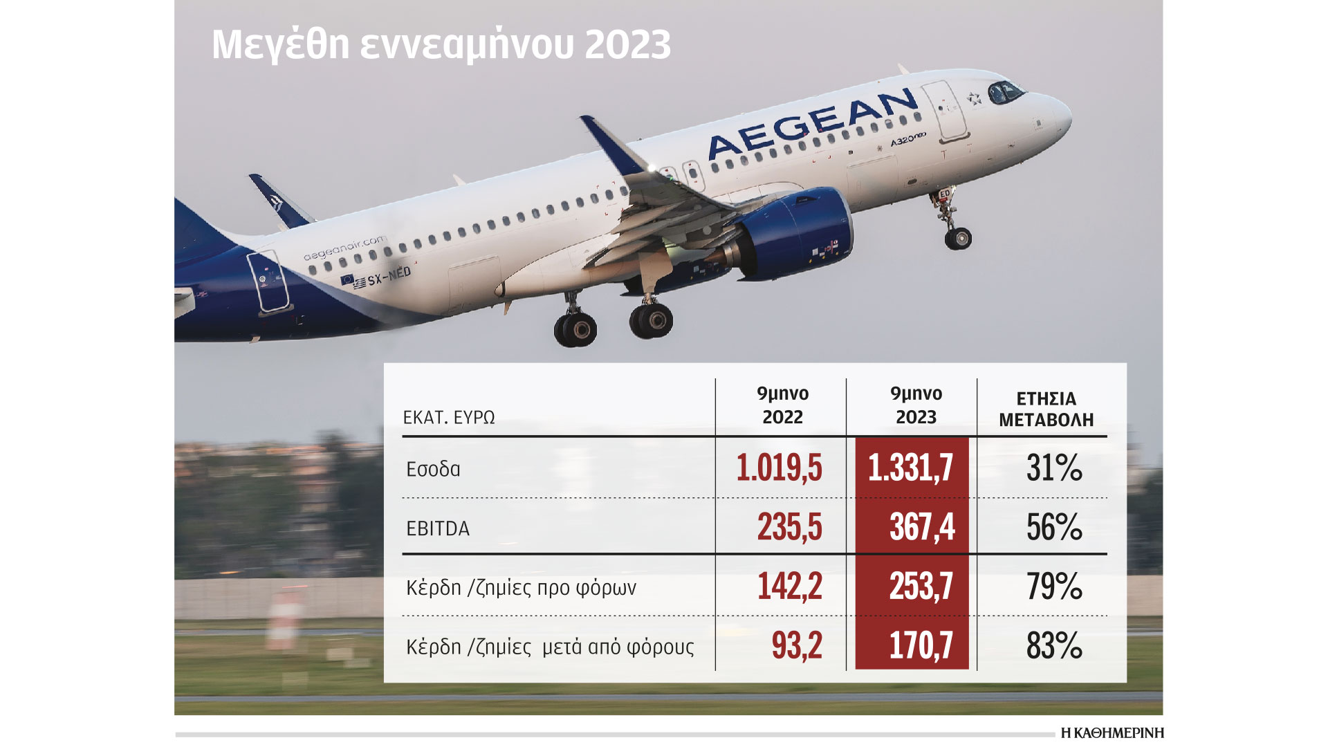 Αντανάκλαση της προσθήκης στον στόλο των αεροσκαφών νέας τεχνολογίας (A320neo), της προαγοράς αεροπορικού καυσίμου, της σημαντικής αύξησης της πληρότητας των πτήσεων και των καλών επιδόσεων του ελληνικού τουρισμού αποτελούν τα μεγέθη τρίτου τριμήνου και εννεαμήνου της Aegean, που είναι υψηλότερα από ποτέ. H αεροπορική, έναντι του εννεαμήνου του 2022, αύξησε τον ενοποιημένο (σε επίπεδο ομίλου) κύκλο εργασιών κατά 31%, σε 1,33 δισ. ευρώ και μετέφερε 12,2 εκατ. επιβάτες, αριθμός αυξημένος κατά 30% συγκριτικά με πέρυσι. Από αυτούς 7,3 εκατ. αντιστοιχούν σε διεθνείς ταξιδιώτες. Ενίσχυσε τα κέρδη προ φόρων κατά περισσότερο από 79%, σε 217,5 εκατ. ευρώ, ενώ σημαντικά αυξημένα κατά 83%, σε περίπου 171 εκατ. ευρώ, ήταν και τα κέρδη μετά από φόρους σε σχέση με το εννεάμηνο του 2022.