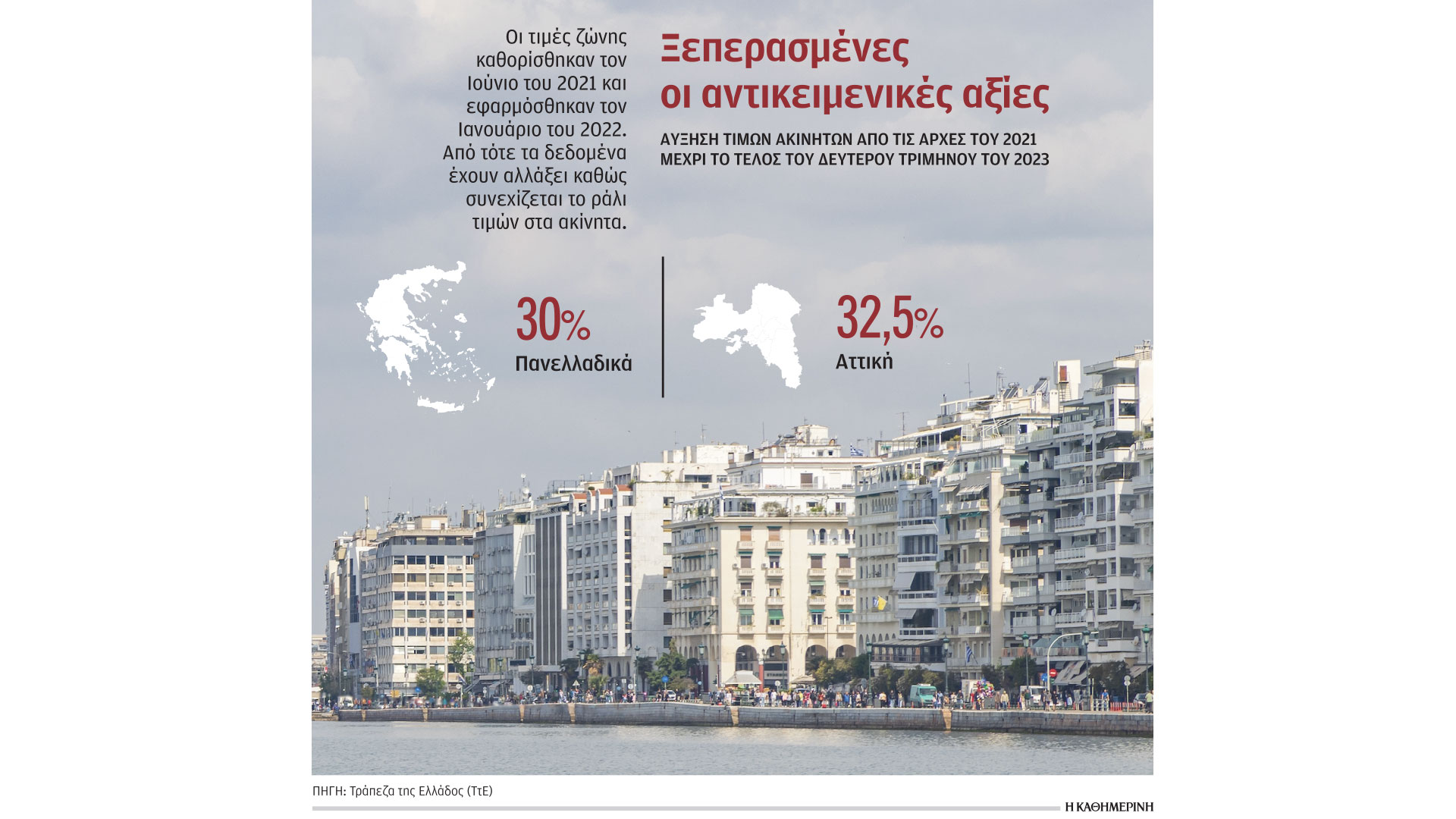 Σύμφωνα με τα στοιχεία της Τράπεζας της Ελλάδος (ΤτΕ), από τις αρχές του 2021 και μέχρι το τέλος του φετινού δεύτερου τριμήνου, οι τιμές στην Αττική έχουν αυξηθεί κατά 32,5%, με τις αυξήσεις σε βόρεια και νότια προάστια να εκτιμάται ότι είναι ακόμη υψηλότερες. Σε πανελλαδικό επίπεδο, δε, η αύξηση των τιμών κατά την ίδια περίοδο διαμορφώνεται σε 30% κατά μέσον όρο, χωρίς ιδιαίτερη διαφορά είτε πρόκειται για νεόδμητο ακίνητο είτε για μεγαλύτερης ηλικίας.