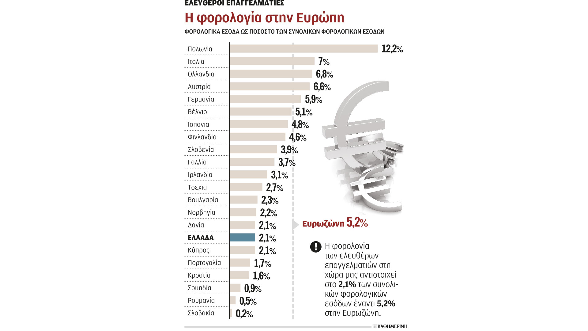 Αντιθέτως, τα φορολογικά έσοδα από τους ελεύθερους επαγγελματίες, για παράδειγμα, στην Πολωνία αντιστοιχούν στο 12,2% των συνολικών φορολογικών εσόδων.