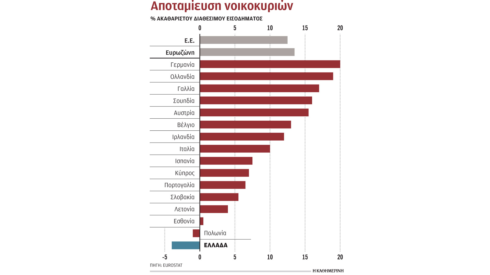 Σύμφωνα με τη Eurostat, ενώ στην Ευρωπαϊκή Ενωση το μέσο νοικοκυριό αποταμίευσε το 12,7% του διαθέσιμου εισοδήματός του, στην Ελλάδα, το ποσοστό ήταν αρνητικό, -4%. Αυτό σημαίνει, όπως επισημαίνει και η ανακοίνωση της Ευρωπαϊκής Στατιστικής Υπηρεσίας, ότι τα νοικοκυριά ξόδεψαν περισσότερο από το ακαθάριστο διαθέσιμο εισόδημά τους και συνεπώς είτε χρησιμοποίησαν συσσωρευμένες αποταμιεύσεις από προηγούμενες περιόδους είτε δανείστηκαν για να χρηματοδοτήσουν τις δαπάνες τους.