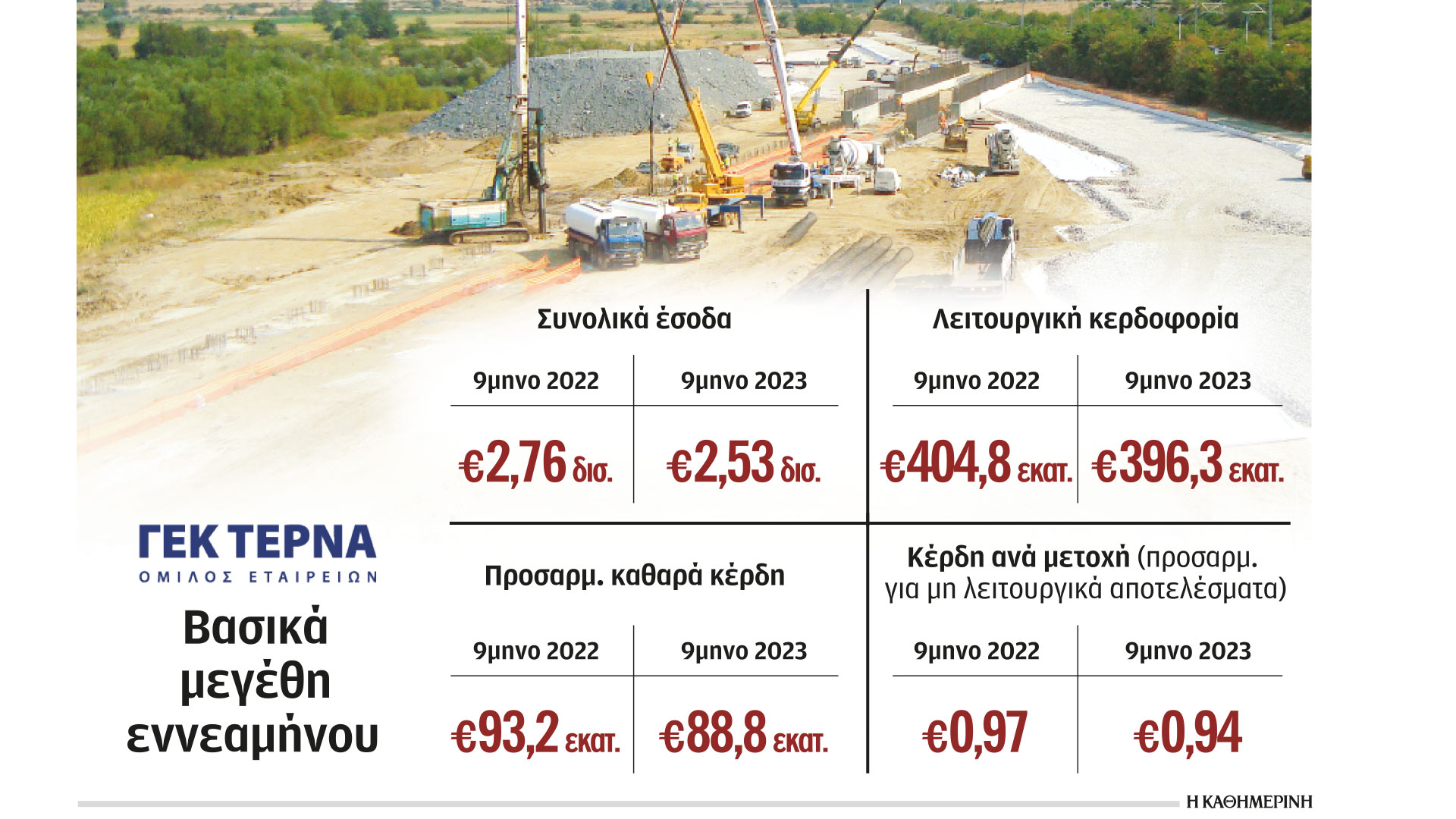 Με υψηλά μεγέθη και ισχυρό ανεκτέλεστο έργων ολοκληρώθηκε το εννεάμηνο της φετινής χρήσης για τον όμιλο ΓΕΚ ΤΕΡΝΑ. Σύμφωνα με τα οικονομικά αποτελέσματα που ανακοινώθηκαν χθες, τα συνολικά έσοδα του ομίλου για το εννεάμηνο διαμορφώθηκαν σε 2,5 δισ. ευρώ έναντι 2,7 δισ. ευρώ την αντίστοιχη περίοδο του 2022 και ευθυγραμμίζονται με την εξομάλυνση των συνθηκών στην αγορά ενέργειας, όπου το προηγούμενο έτος υπήρξε σημαντική μεταβλητότητα.