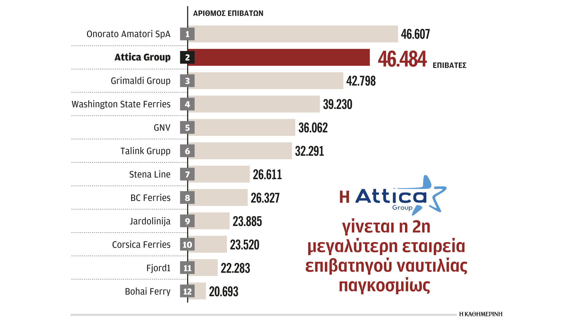 Η Attica Group, μετά και την απορρόφηση της ΑΝΕΚ, η οποία αναμένεται να ολοκληρωθεί το αμέσως επόμενο διάστημα, κατατάσσεται από τον ανεξάρτητο συμβουλευτικό ναυτιλιακό οίκο Shippax ως 2η μεγαλύτερη εταιρεία επιβατηγού ναυτιλίας παγκοσμίως, βάσει ικανότητας μεταφοράς επιβατών και 5η μεγαλύτερη βάσει ικανότητας μεταφοράς φορτηγών.